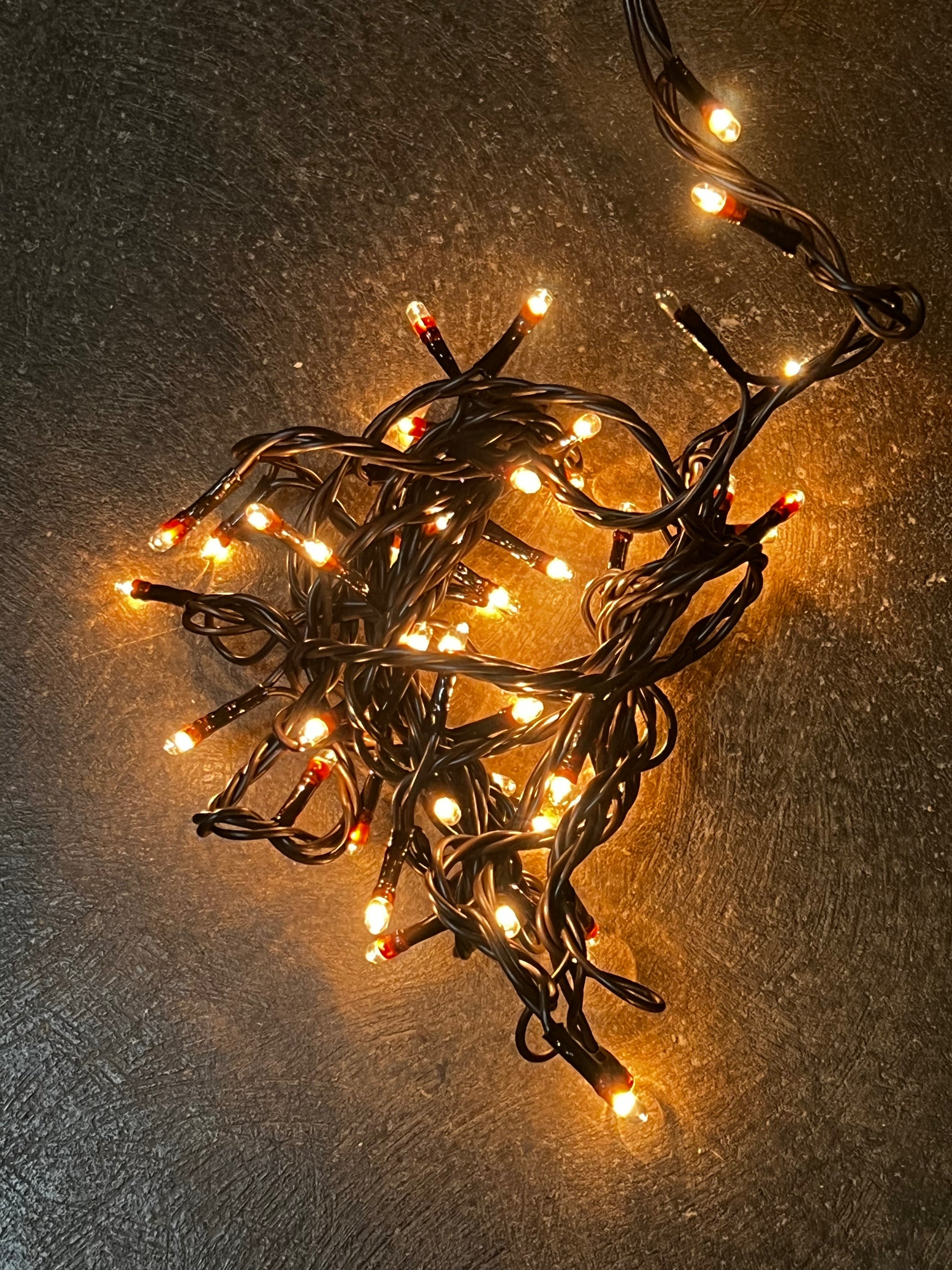 50 Warm White Teeny Bulbs on Brown Wire. 10ft cord, indoor use only.