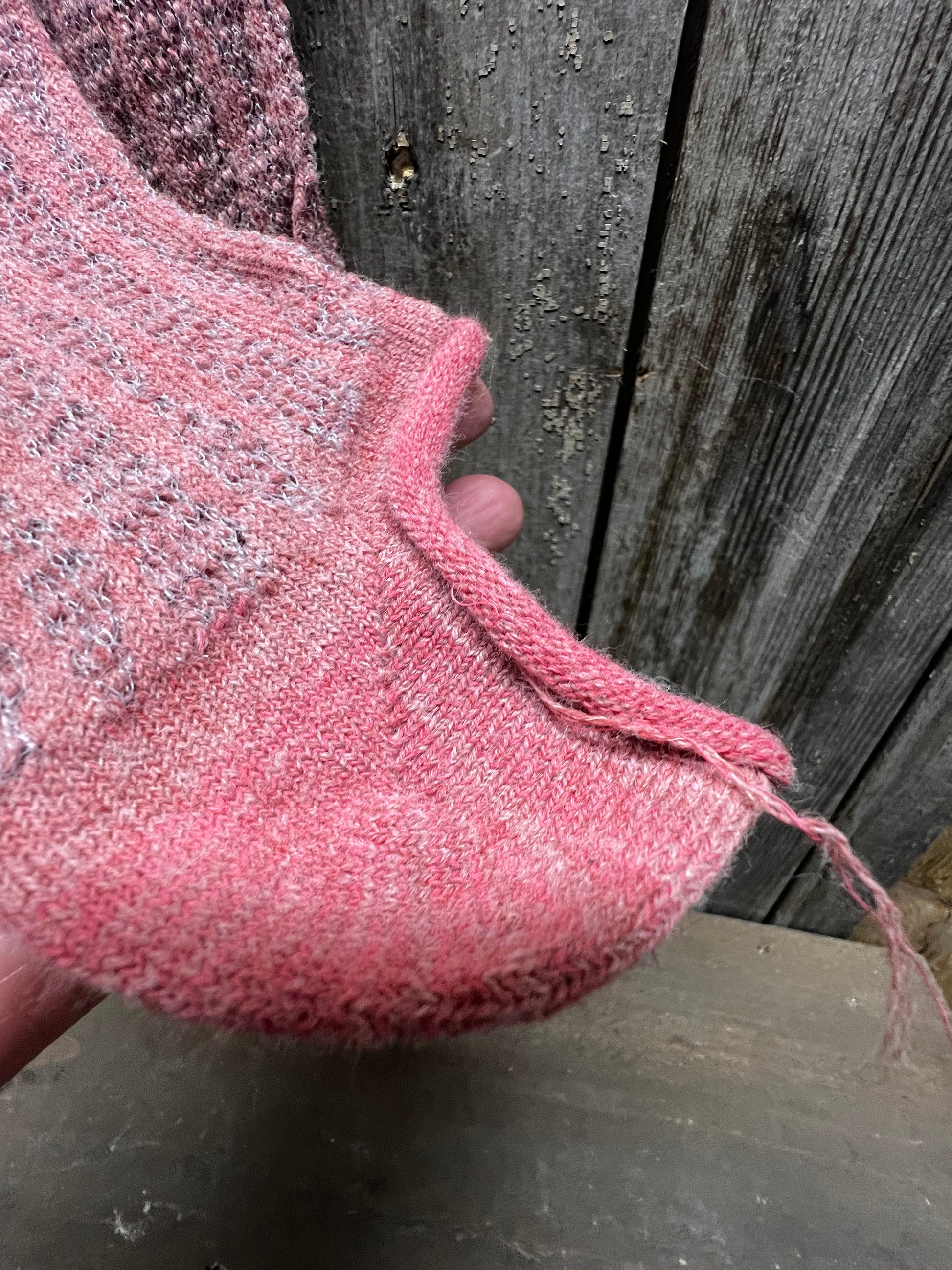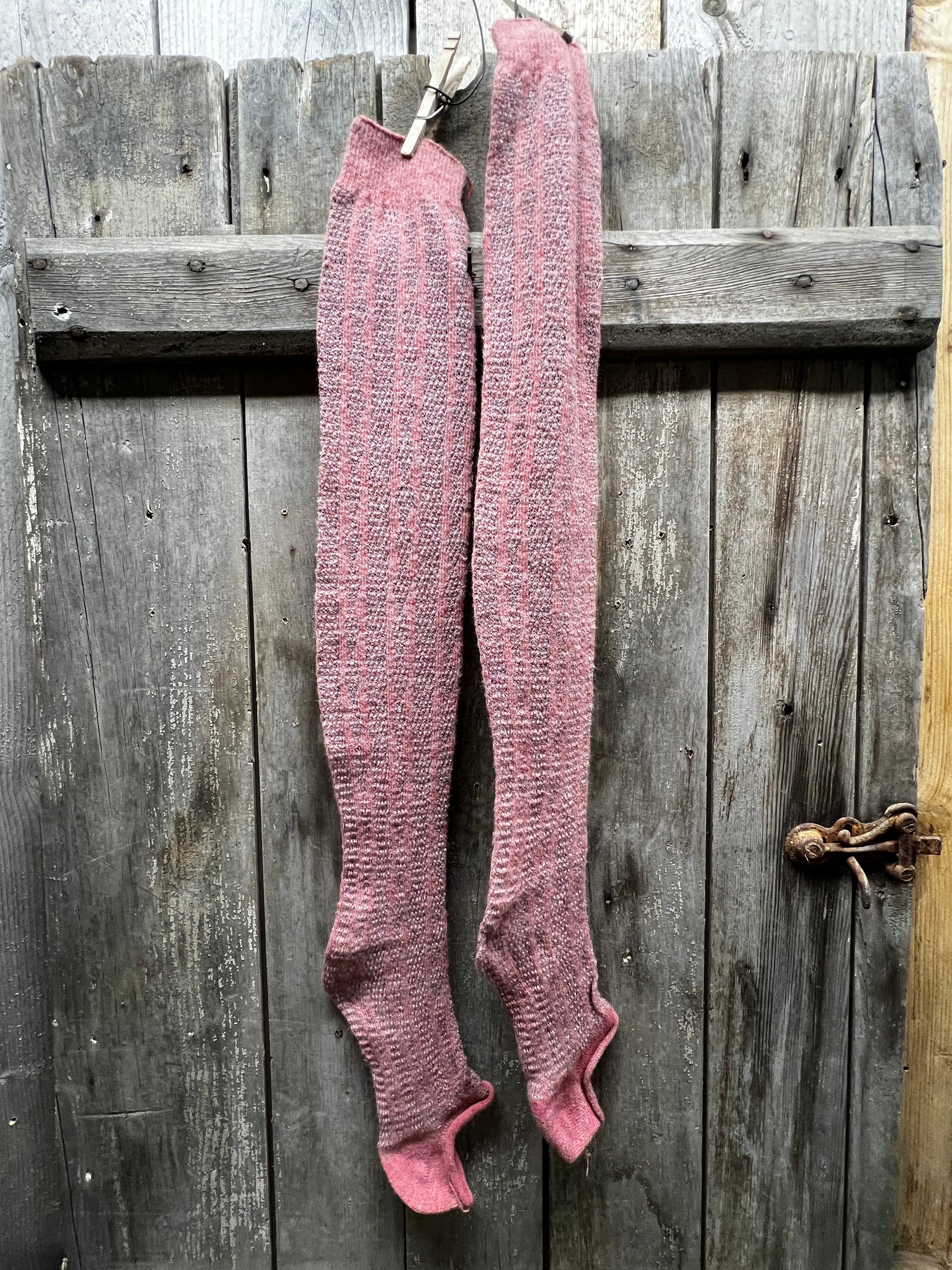 How lovely! Hang over and old dress, from a peg board or fold in a cupboard. This old pair of toeless socks seem to be partially made from wool and show some signs of wear that add to the charm. Roughly 30" long. We have them displayed by old clothespins, not included.