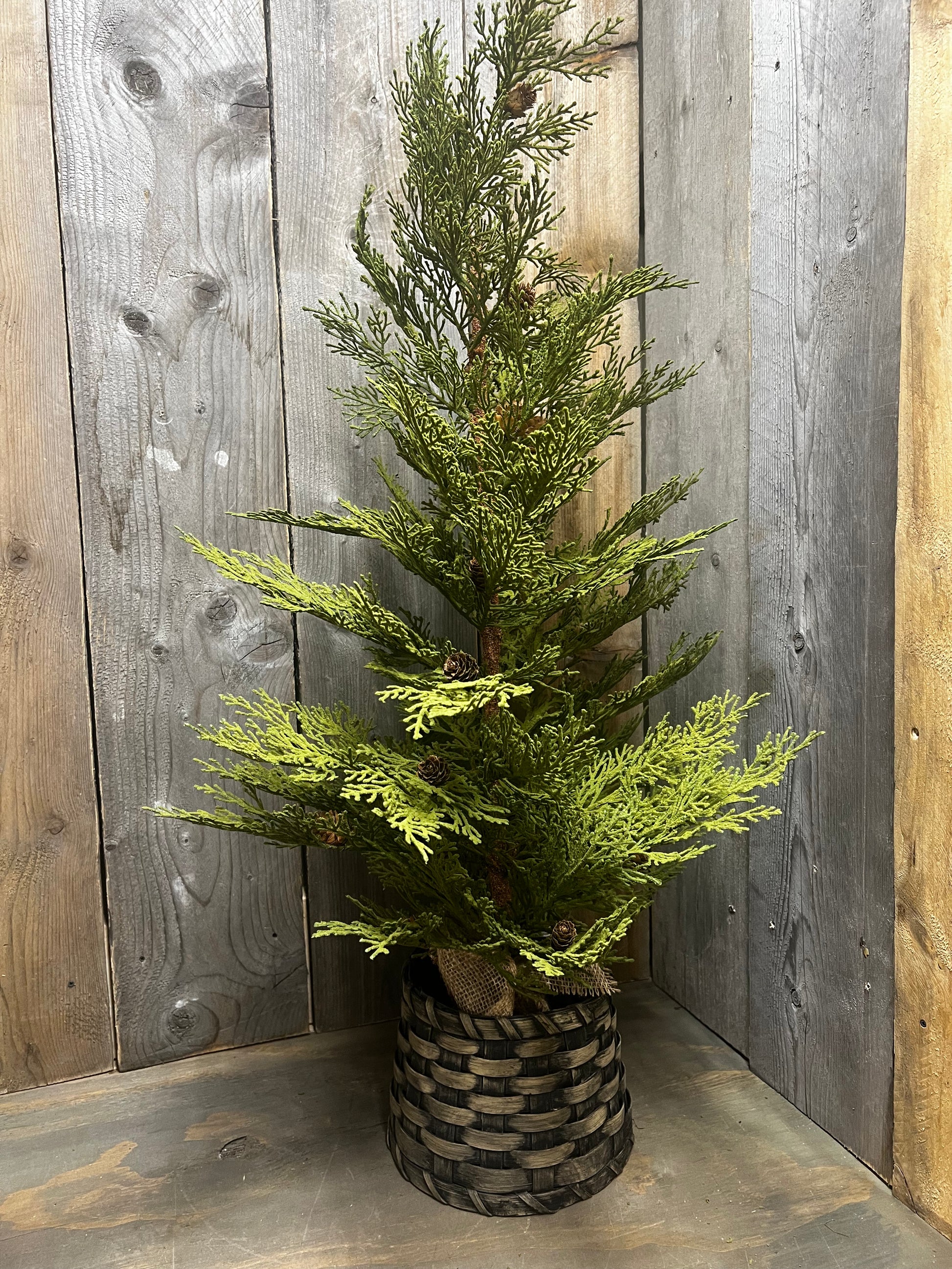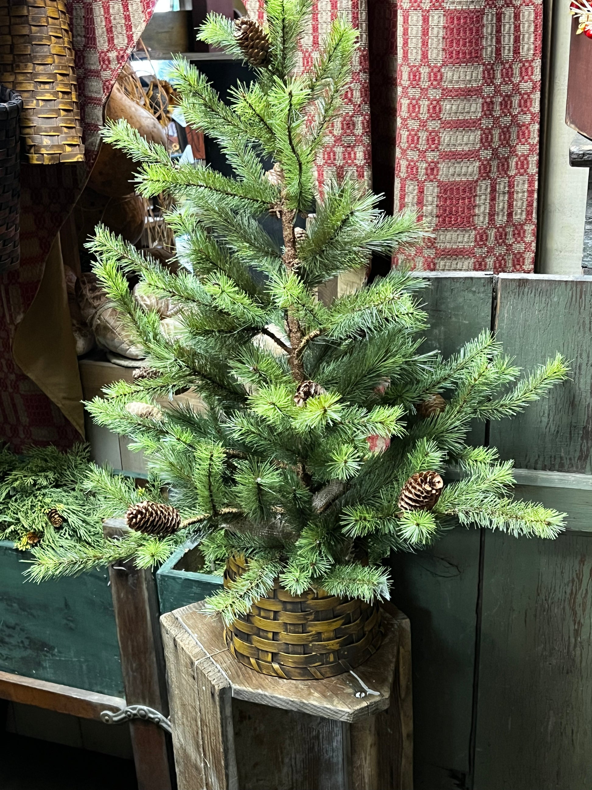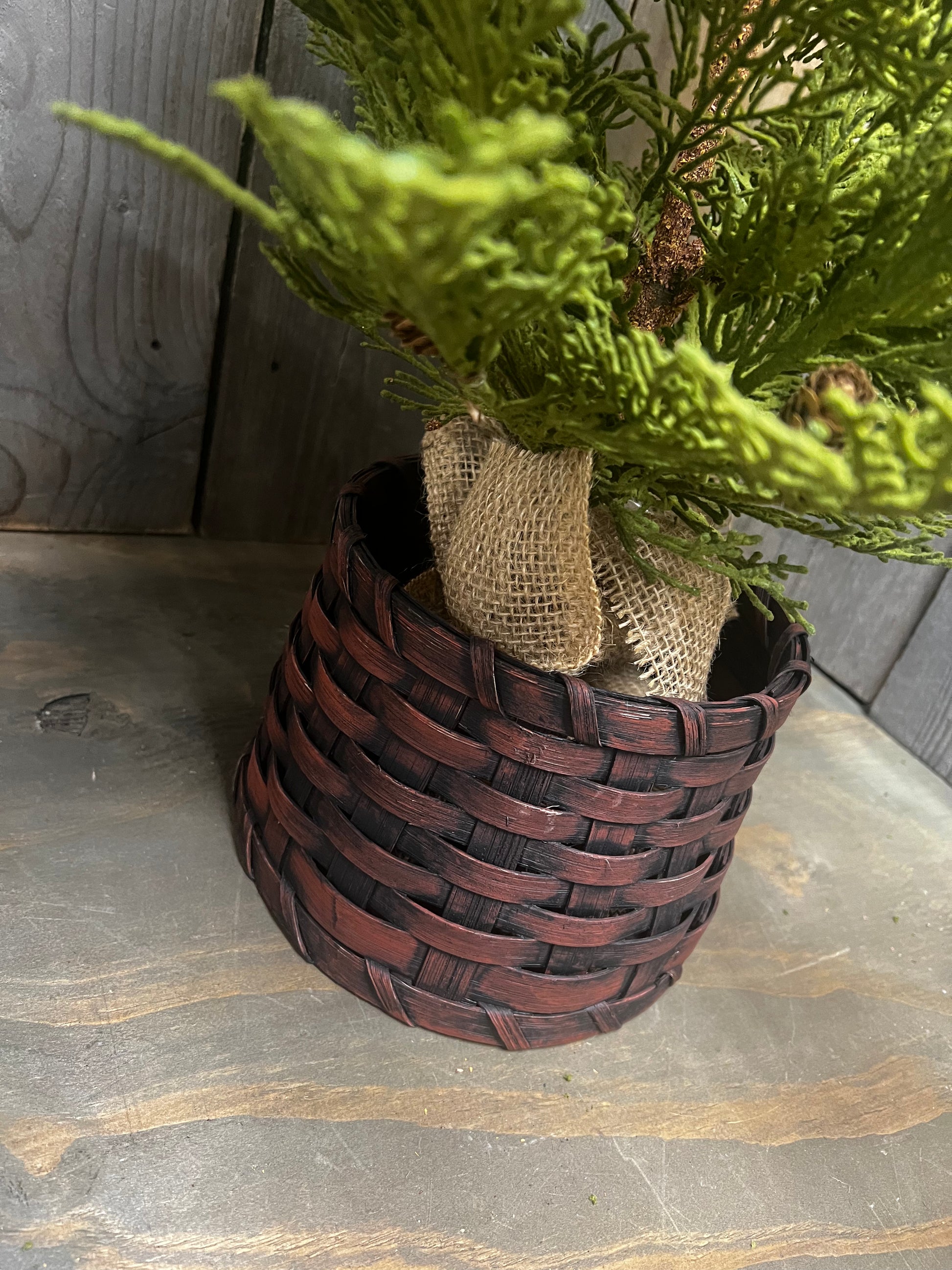 A primitive "skirt" for your primitive tree! Hand crafted in PA, each basket is heirloom quality and done in a base color and then a "washed" stained for a lovely look. Each basket will vary slightly in size due to being hand made; measurements should be considered as approximate. The small basket measures 6.5" opening at the top (7" overall) and a 7" opening at the bottom (7.75" overall). It is 5.75" tall. Shown with a 3’ North Rim Hemlock and a 3’ Caribou Ridge Tree.