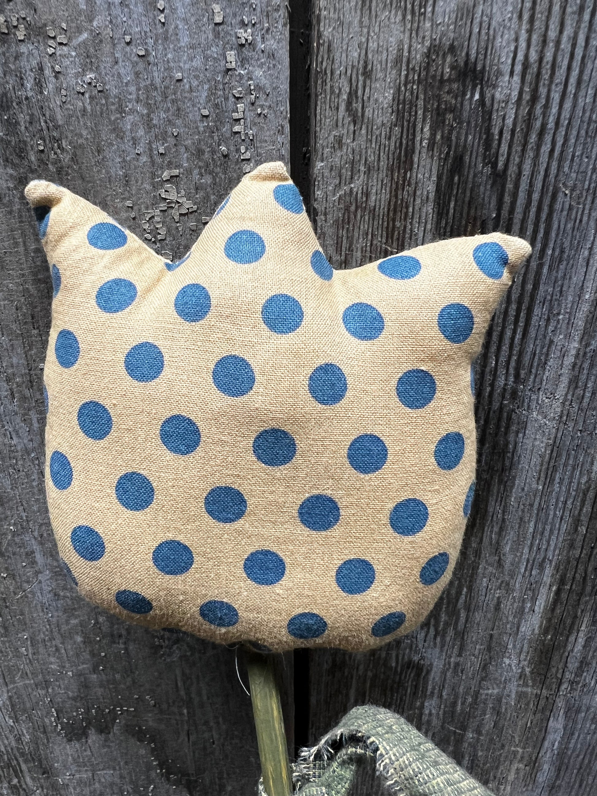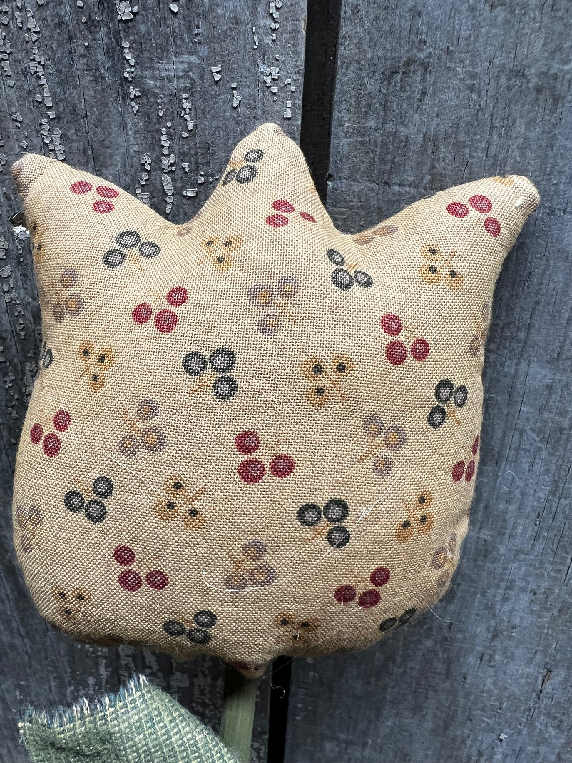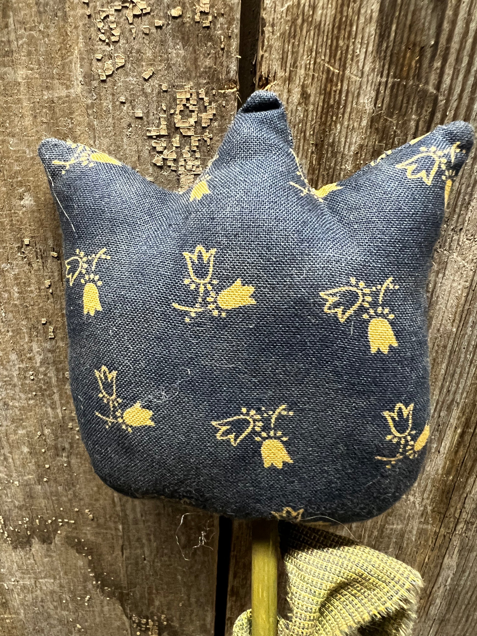 Lovely fabric patterns make beautiful tulips. Hand made in PA, Tulip sizes are 3.5" to 4" high and the "stem" sticks vary in length from 8.5" to 10". Sold by the pattern and not size, we will choose a selection of various sizes. Not all sizes shown.