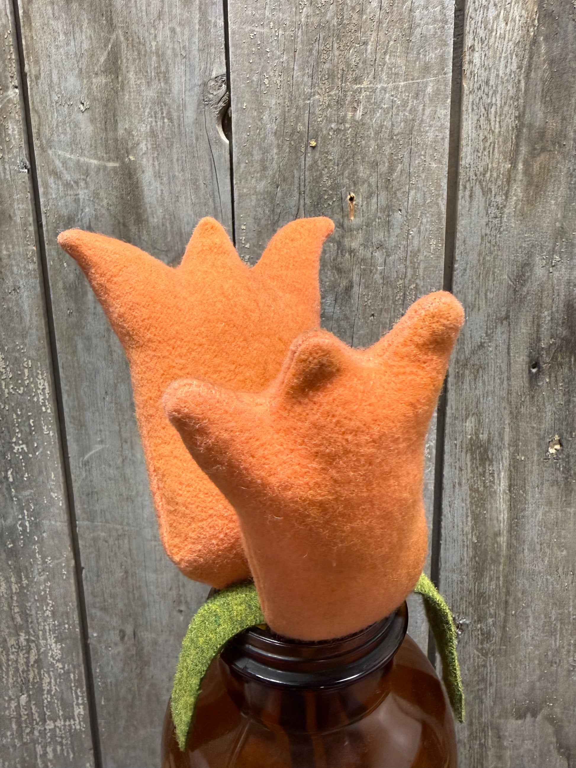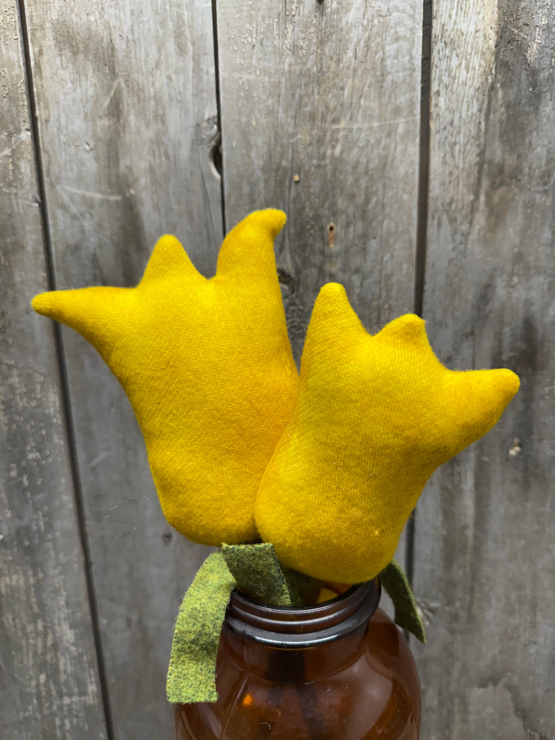Made in PA, these wool tulips are beautifully done! Each comes on a green dowel and tied with green wool. All but the purple set is one of each size. The purple is 2 large. Grunged for a primitive look.