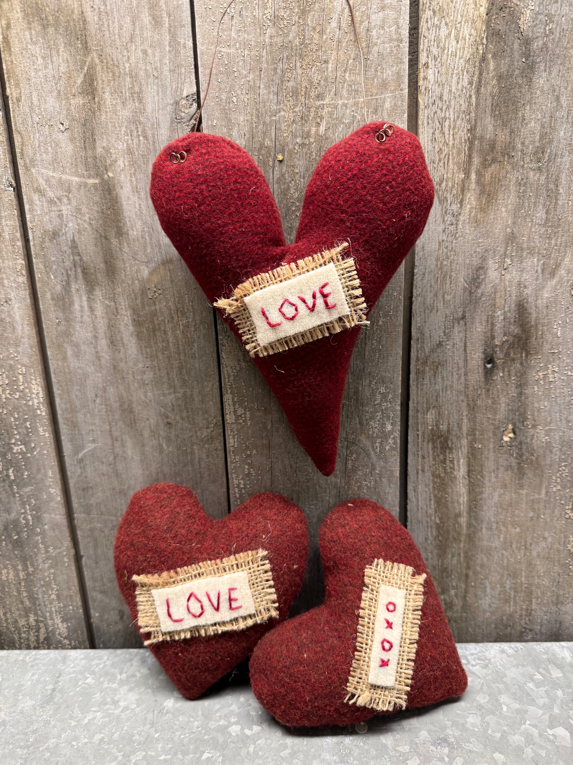 Locally made and full of love. You will receive a set of 3 hearts. The largest is 8" long not including the rusty wire hanger and the other 2 hearts are smaller. The smaller are perfect bowl fillers or can be hung on a tree by adding a hook; not included. Made from coordinating wool, burlap and hand stitching.