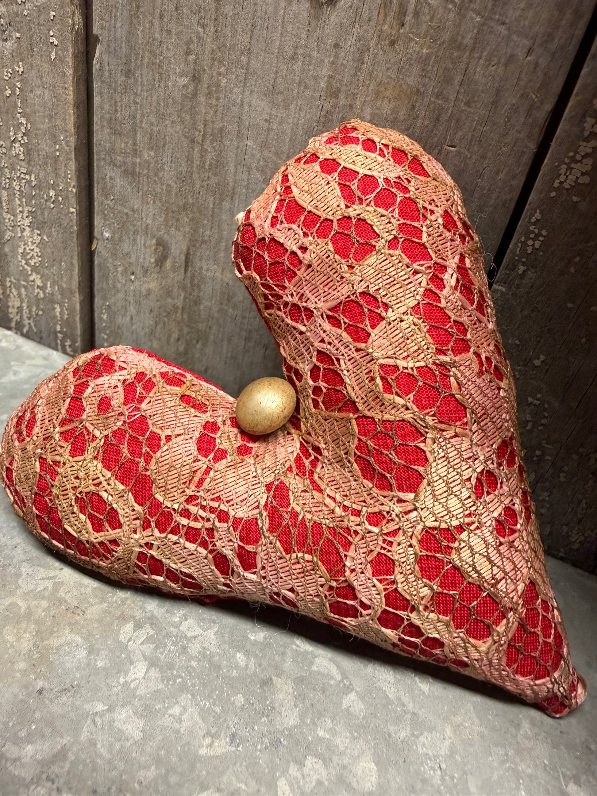 Locally made and full of love. You will receive a set of 2 hearts. The largest is 8" long without the rusty wire hanger. The other hearts can be used in a bowl or can be hung on a tree by adding a hook; not included. Made from muslin and lace, lightly grunged.