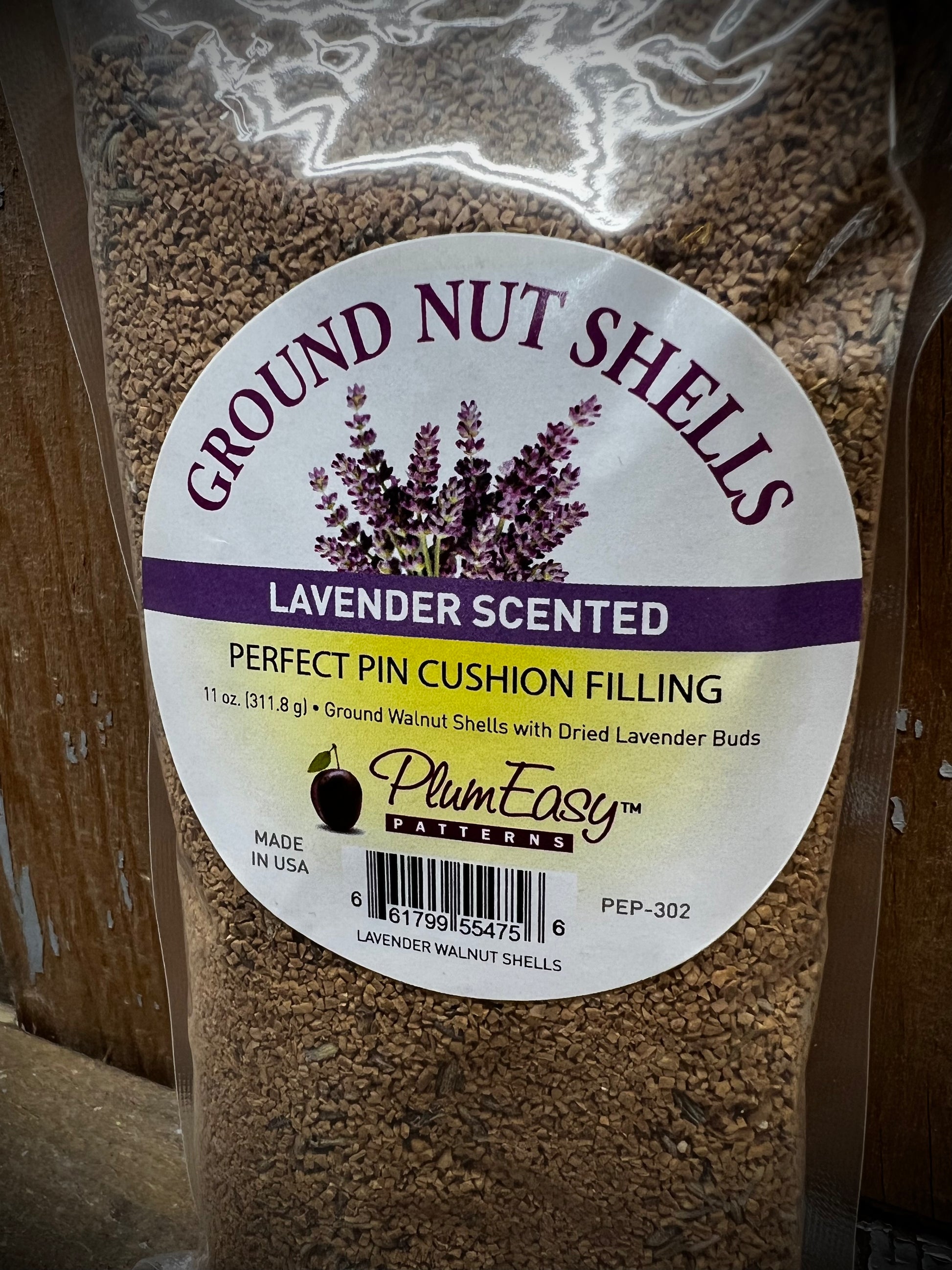 Lavender ground walnut shells are a wonderful filling to use for pin cushions. The lavender gives your pin cushion a lovely aroma and the weight gives it a solid feeling which will not slide around on your table. The bag has 2 cups volume and will fill most pin cushions. The bag has a zip closure and is heavy clear plastic making it easy to use. Also use walnut shells for: bean bags, bags to microwave for warming sore muscles, sewing tube for ironing seams open. Microwaving a lavender/walnut shell bag smells heavenly.