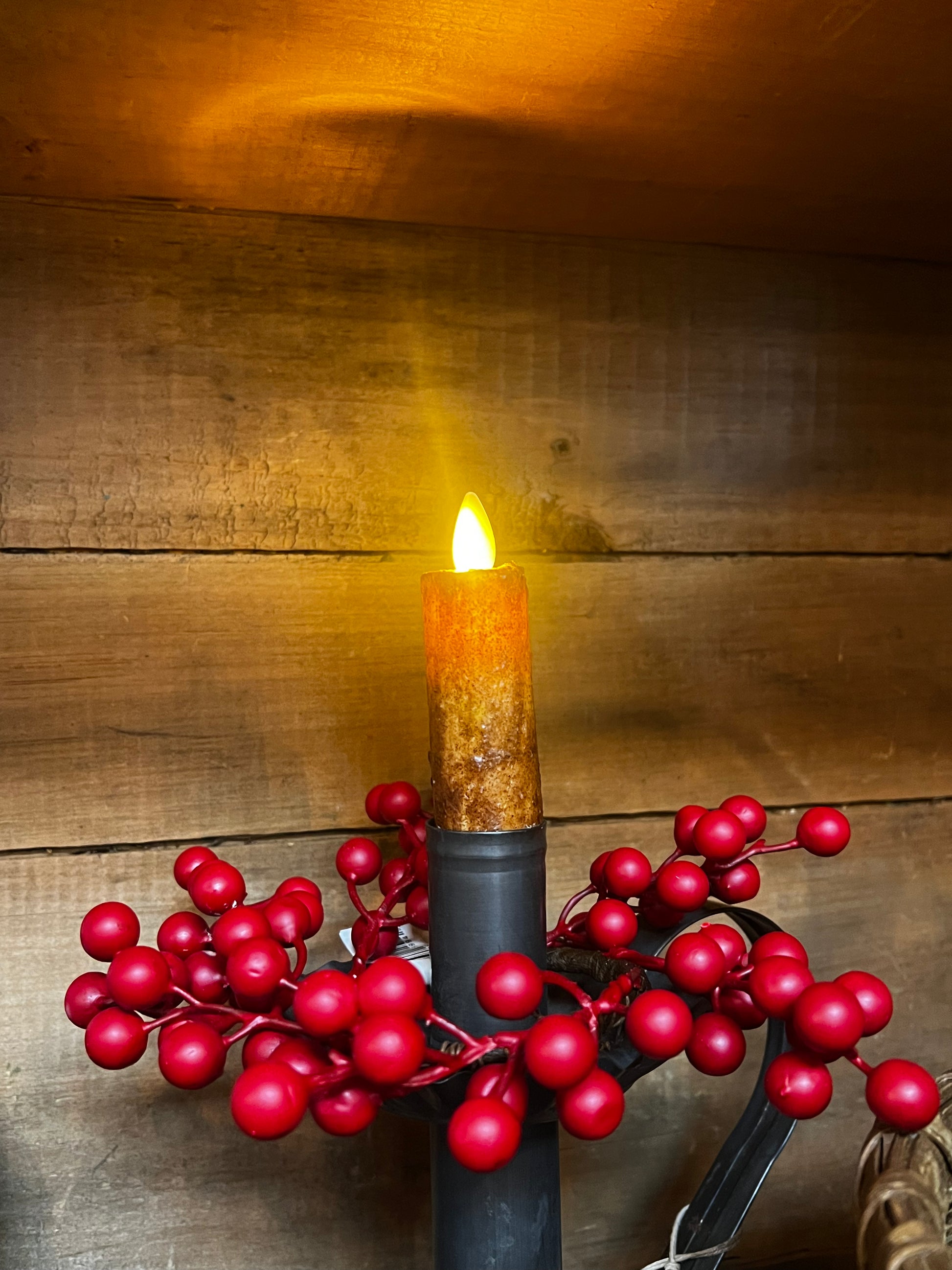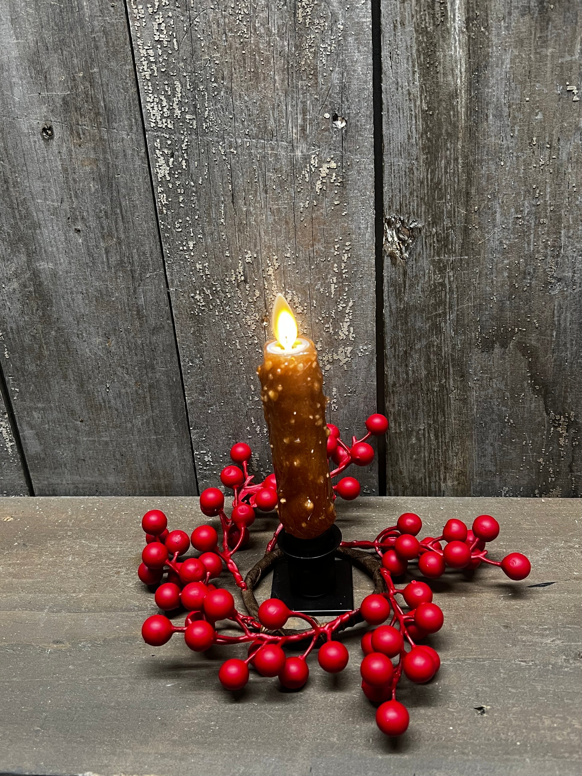 Our MATTE weatherproof Berry collection is a best seller every year and always sells out early! They are great for outdoor decorating and will not "pop" when they get wet. The dull MATTE finish is so popular among the primitive lovers rather than the a shiny, glossy red. The 2" Candle Ring is about 7" overall and is so beautiful! Use indoors or outdoors on smaller taper candles and chandeliers.