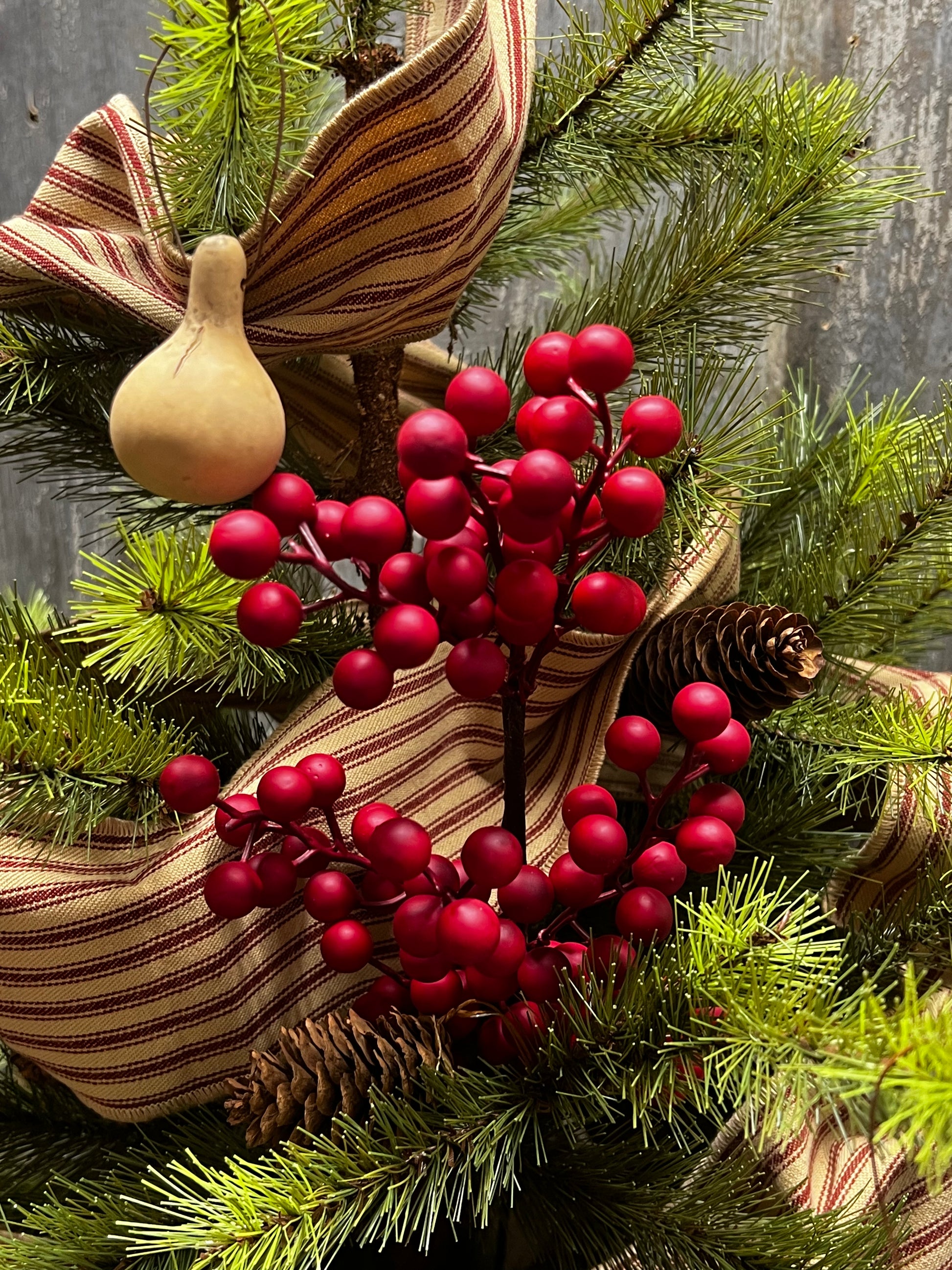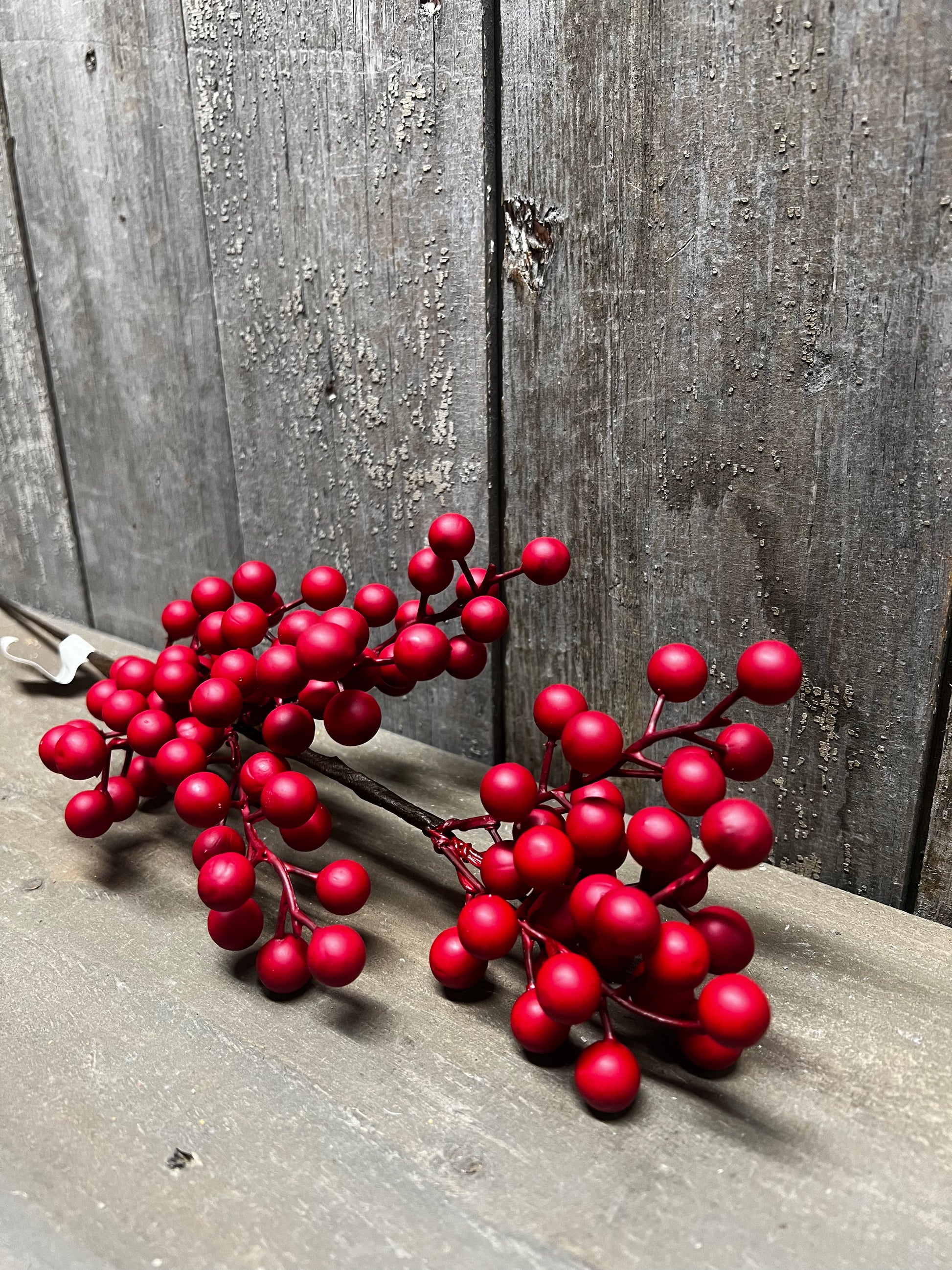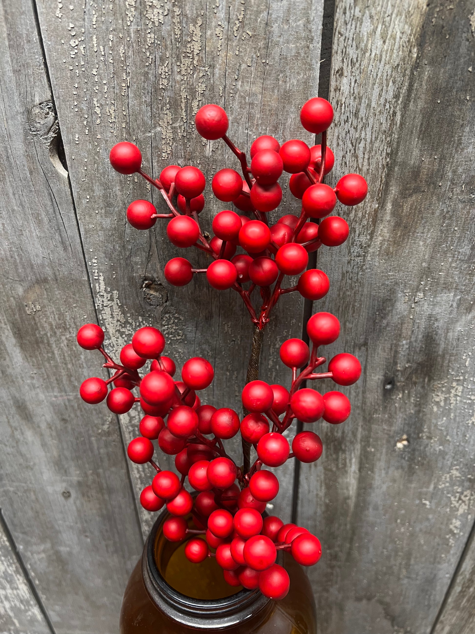 Our MATTE weatherproof Berry collection is a best seller every year and always sells out early! They are great for outdoor decorating and will not "pop" when they get wet. The dull MATTE finish is so popular among the primitive lovers rather than the a shiny, glossy red. Also shown used in a tree.