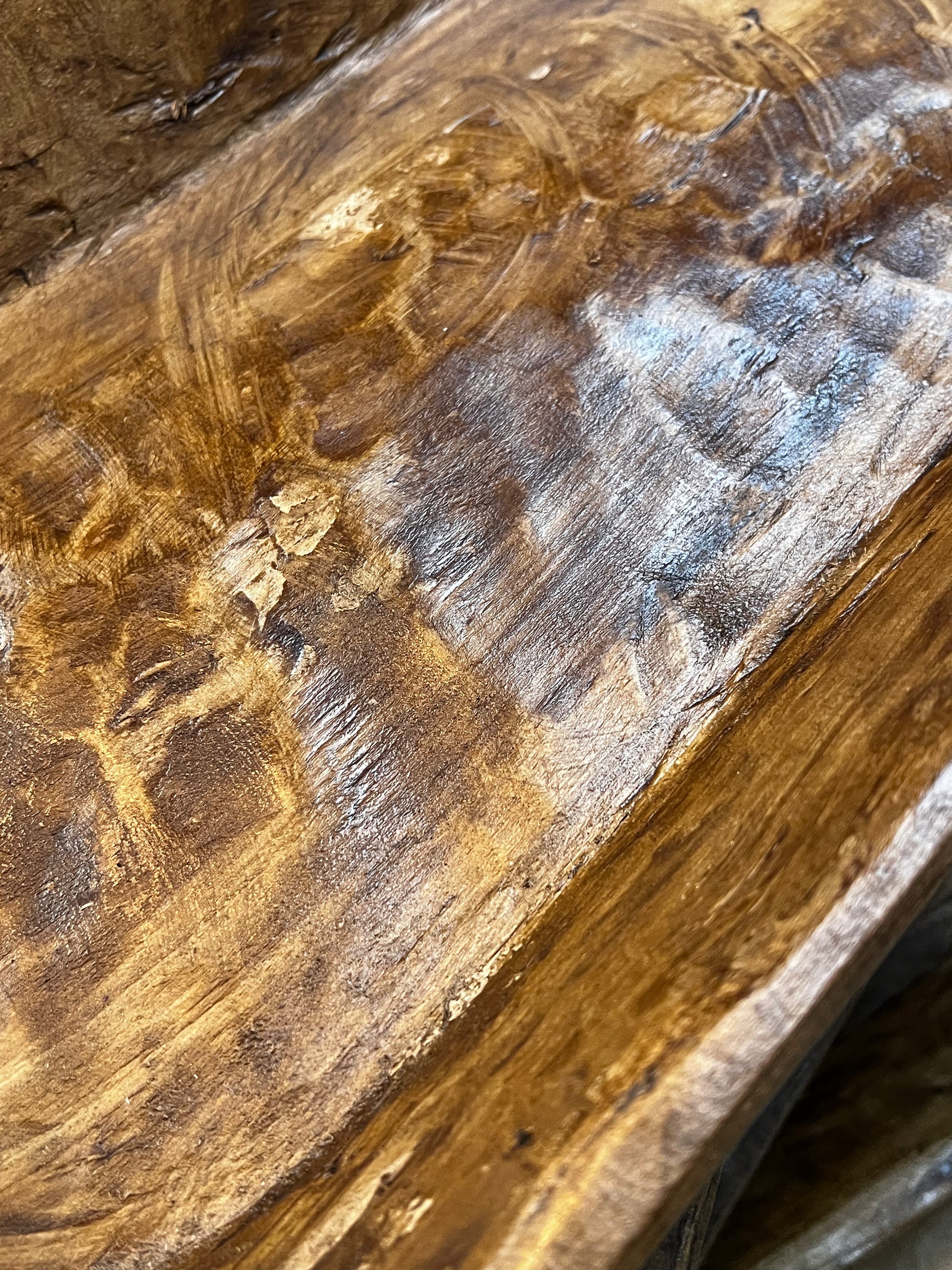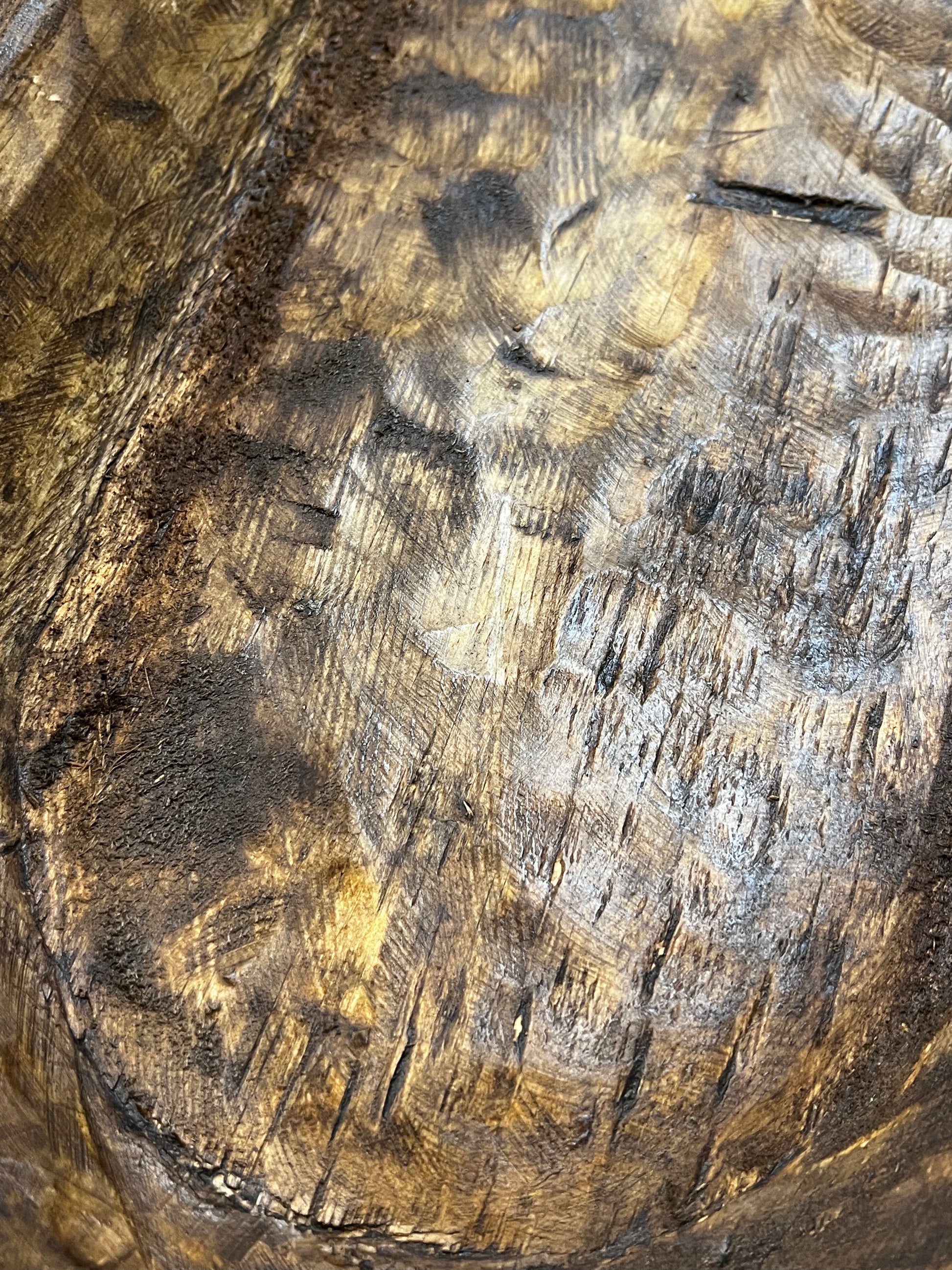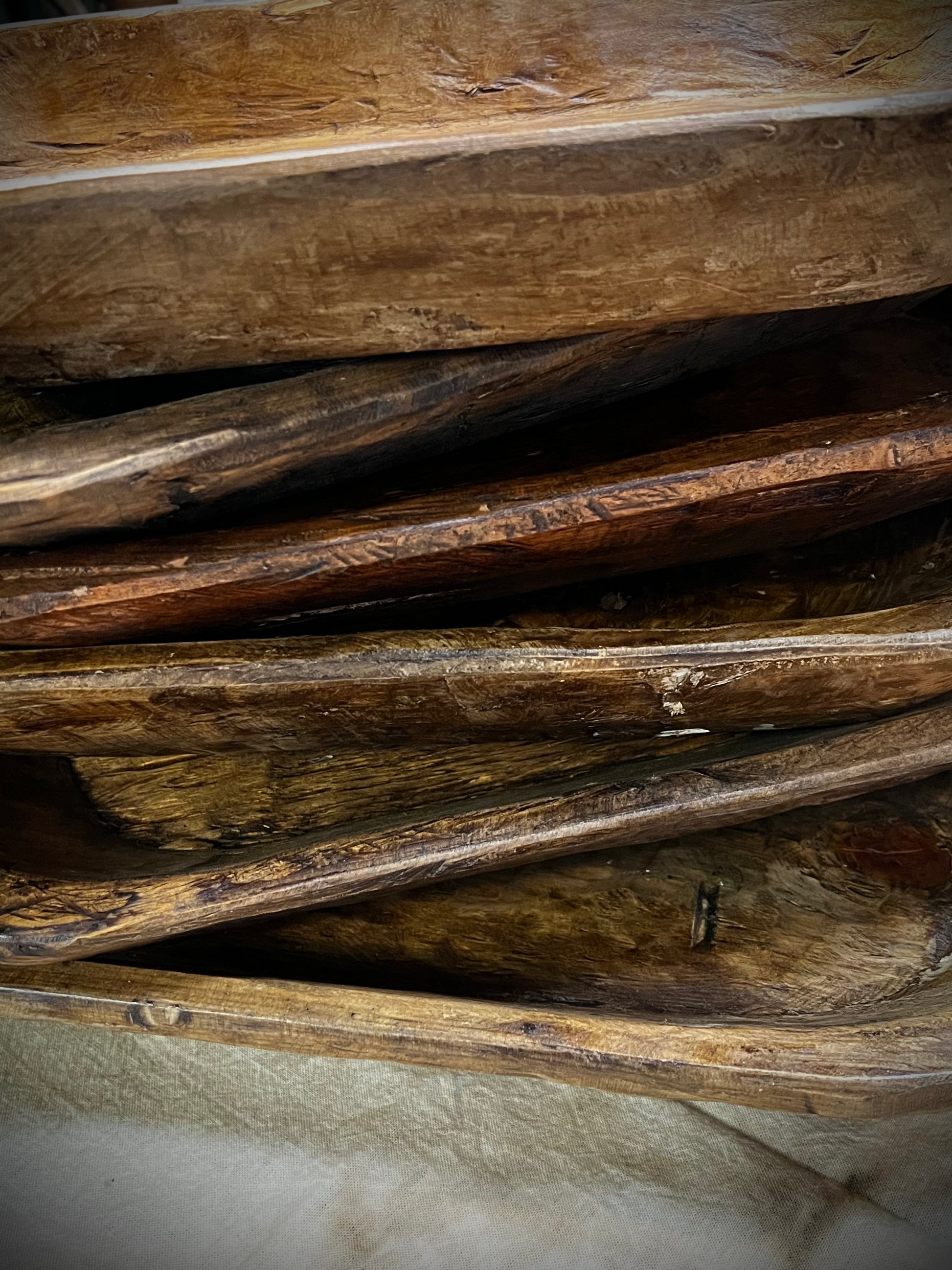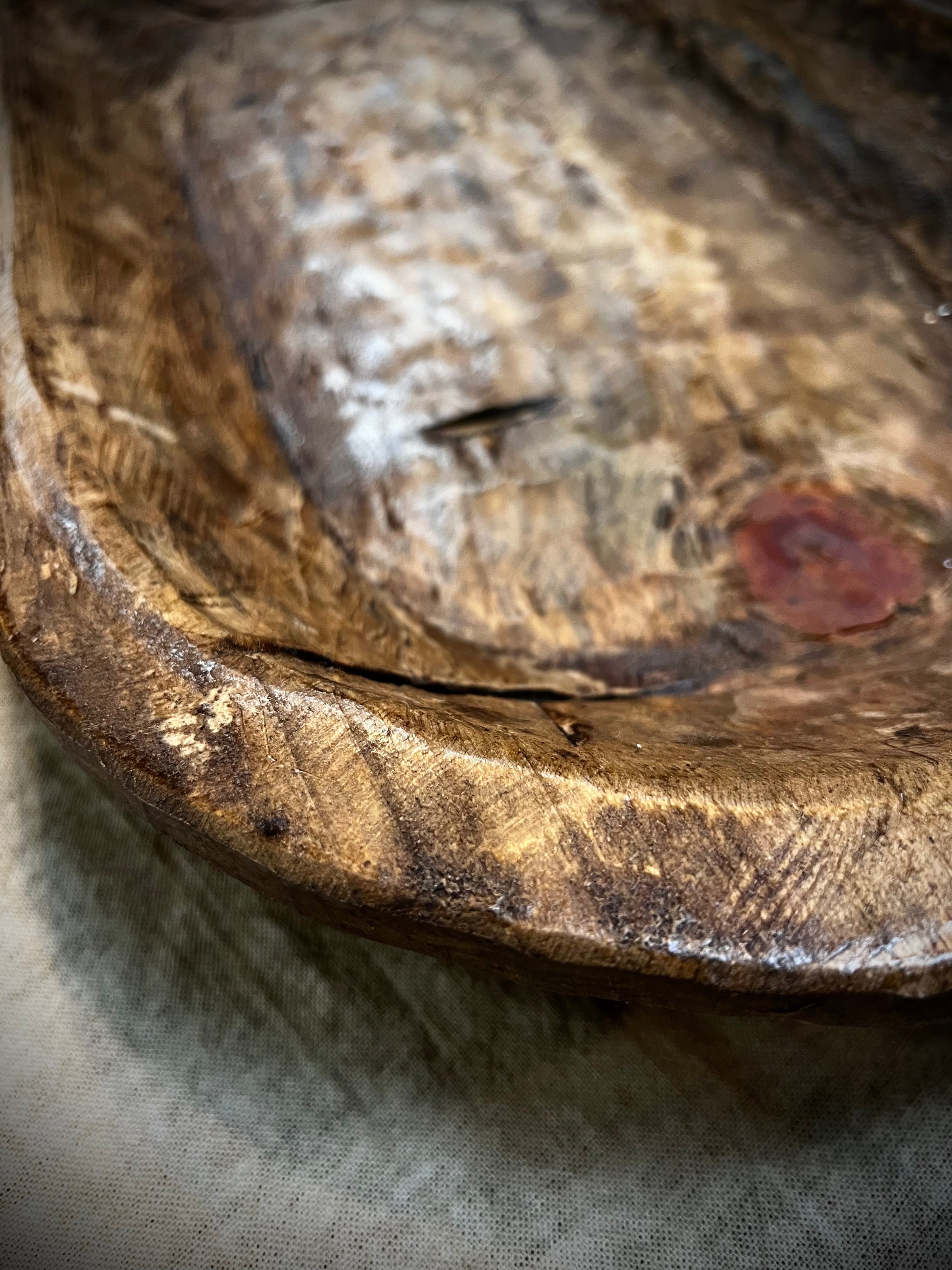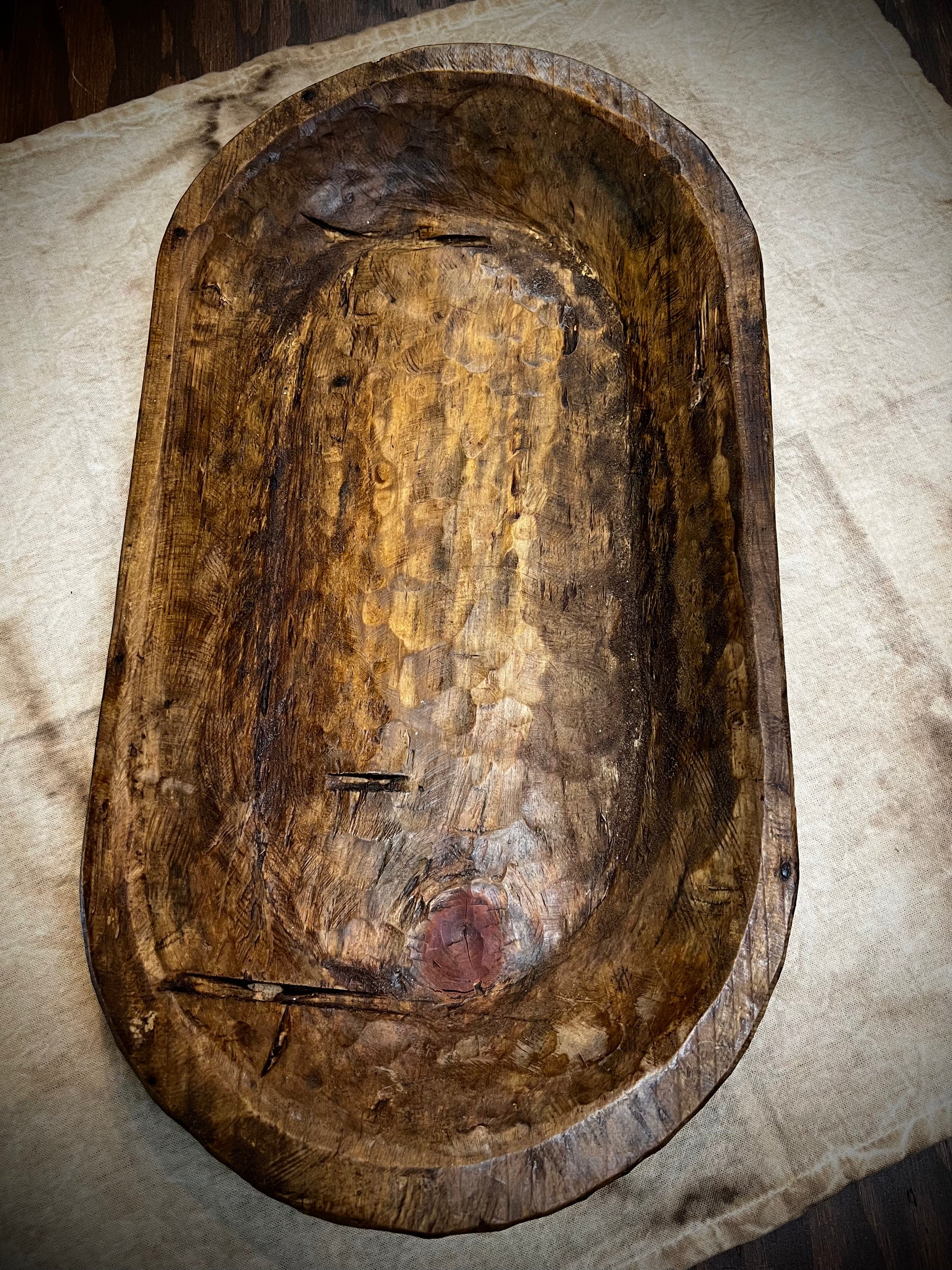 This unique medium bowl/trencher is crafted from Spanish oak for a hand-carved, rustic aesthetic. Perfect for displaying accents and drieds, or even greenery. It measures 20"x12"x4". Natural variations such as knot holes, scrapes, and minor cracks are part of the product's charm. Not Candle ready.