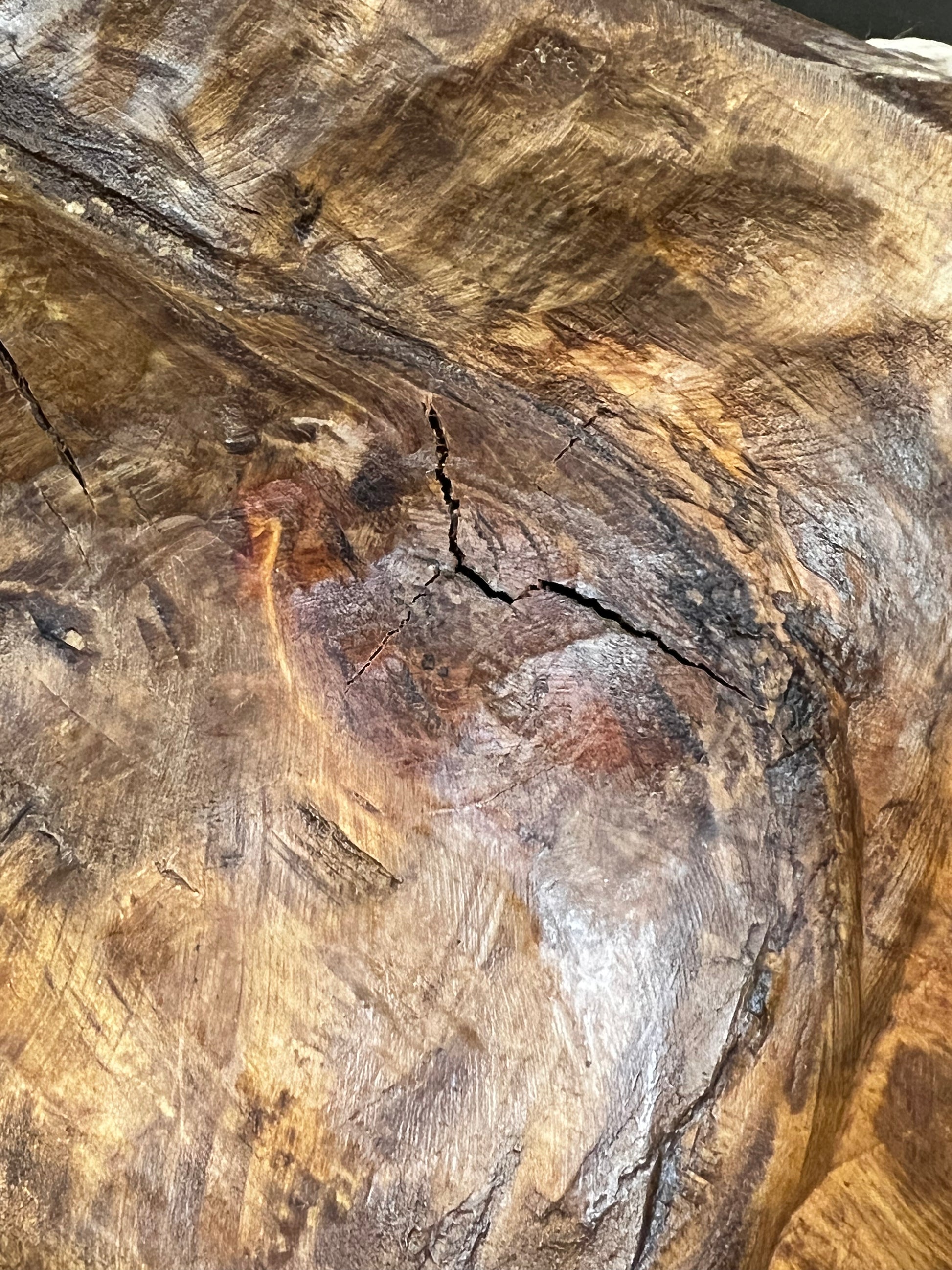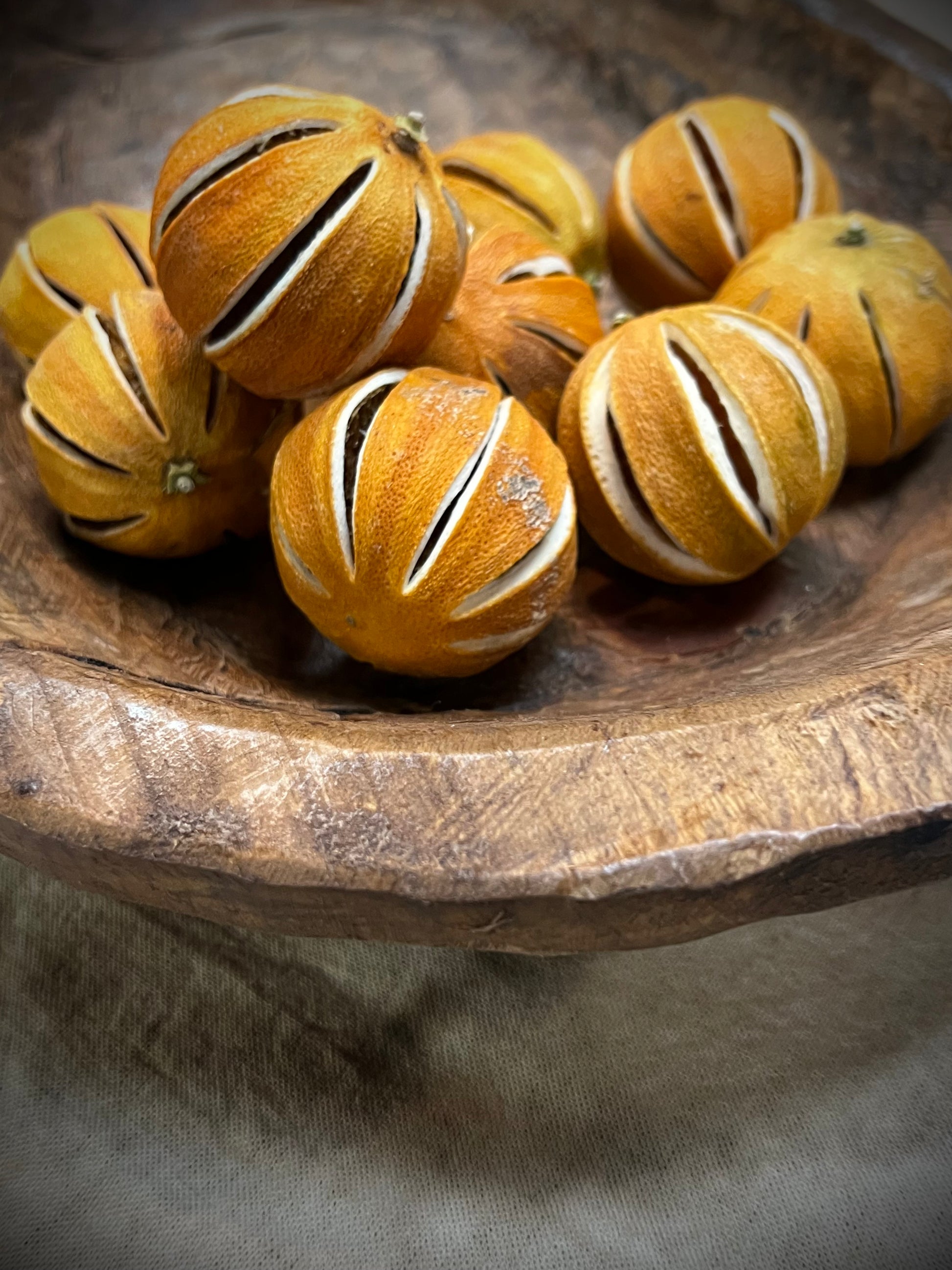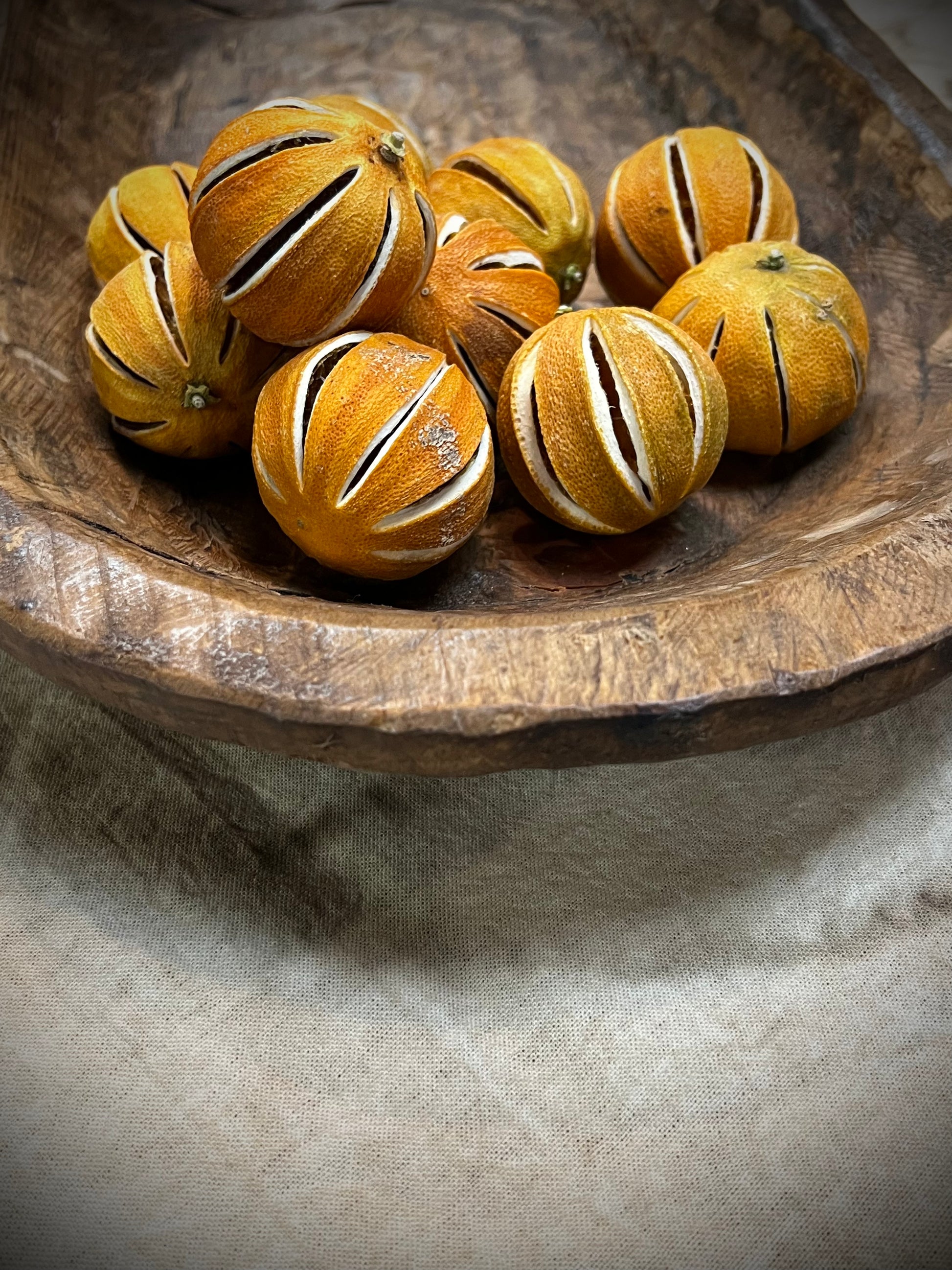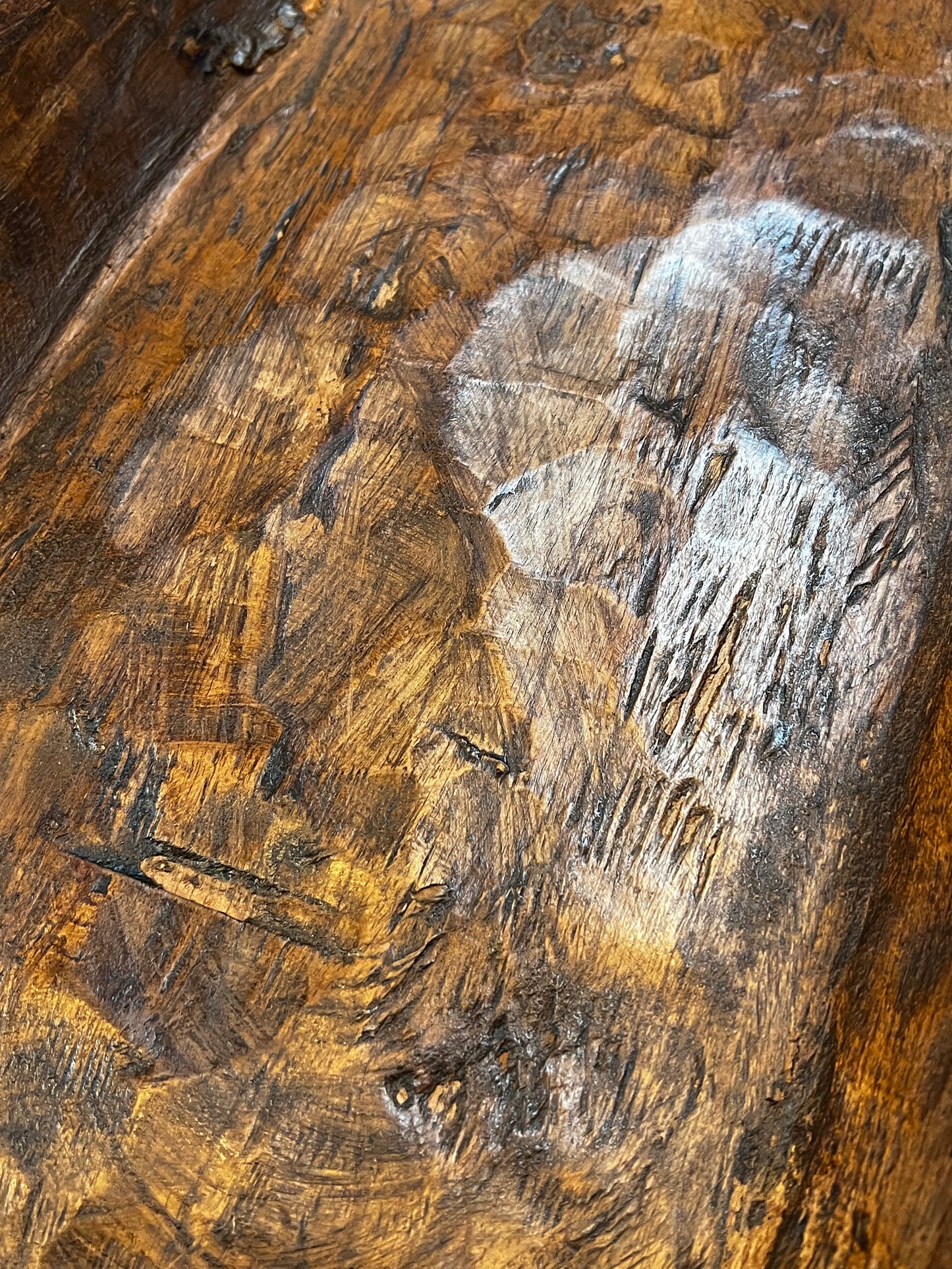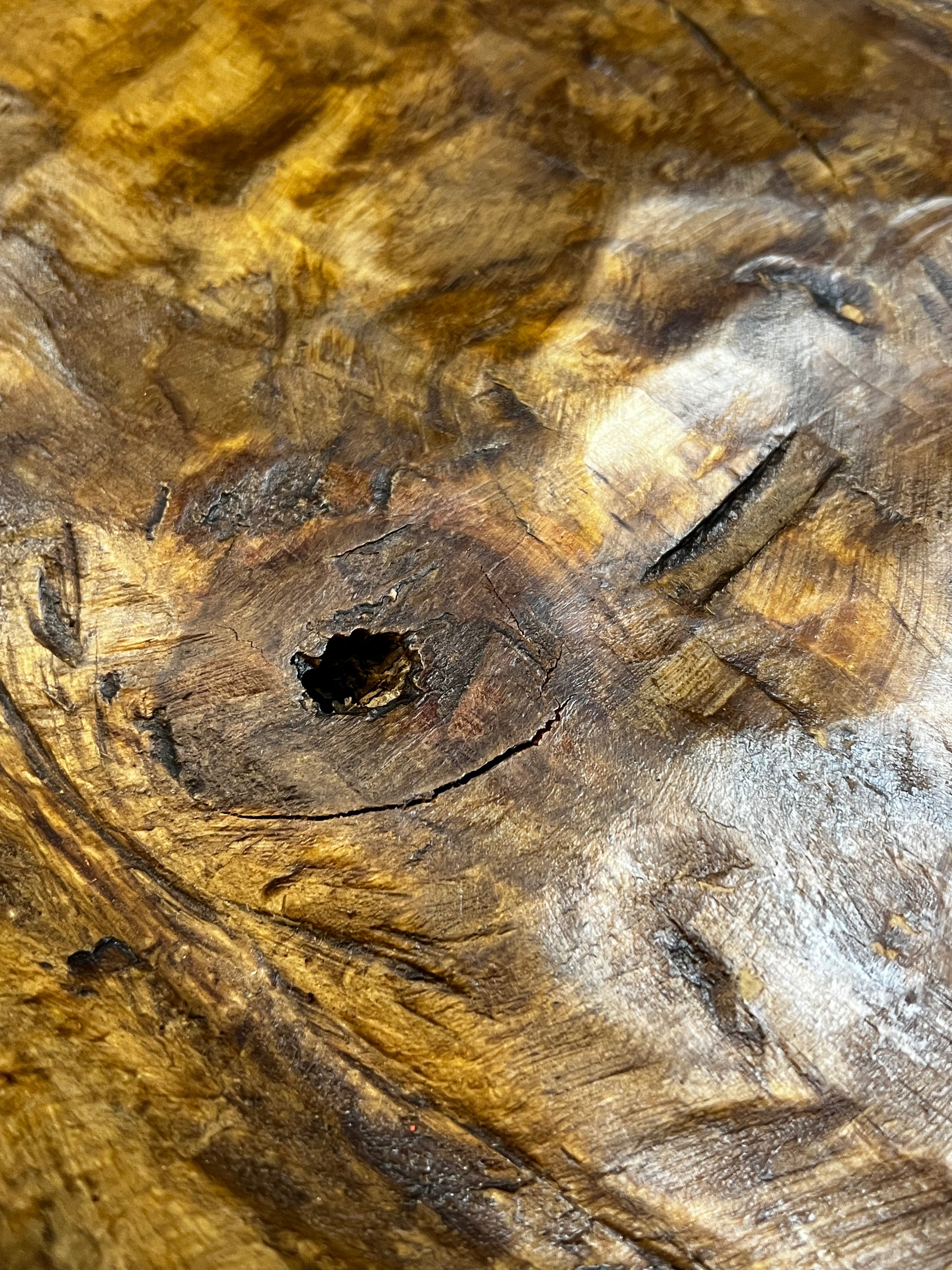 This unique medium bowl/trencher is crafted from Spanish oak for a hand-carved, rustic aesthetic. Perfect for displaying accents and drieds, or even greenery. It measures 20"x12"x4". Natural variations such as knot holes, scrapes, and minor cracks are part of the product's charm. Not Candle ready.