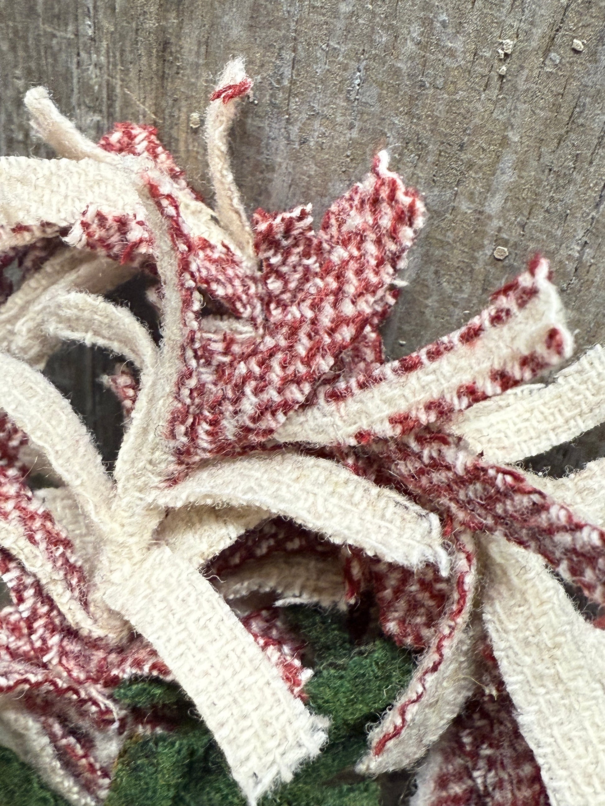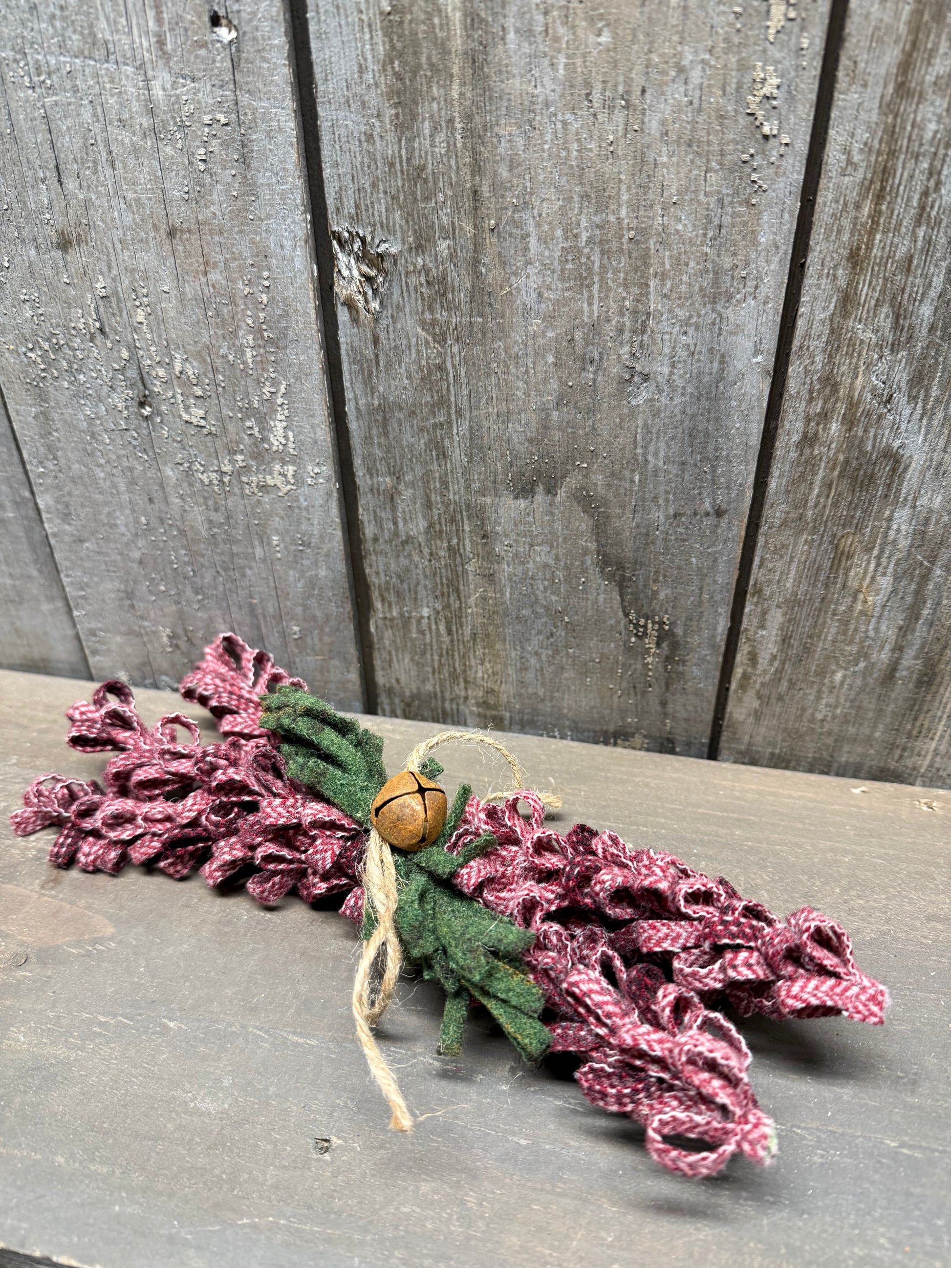 Hand made from Wool, our local friend has made some "sweet" treats out of wool. A set of 3 "peppermint sticks" measures about 10" long, is tied with a jute bow and has some wool greens; 2 options of wool. The Candy Canes are also a set of 3 and they measures 8" long. Each has a rusty bell.