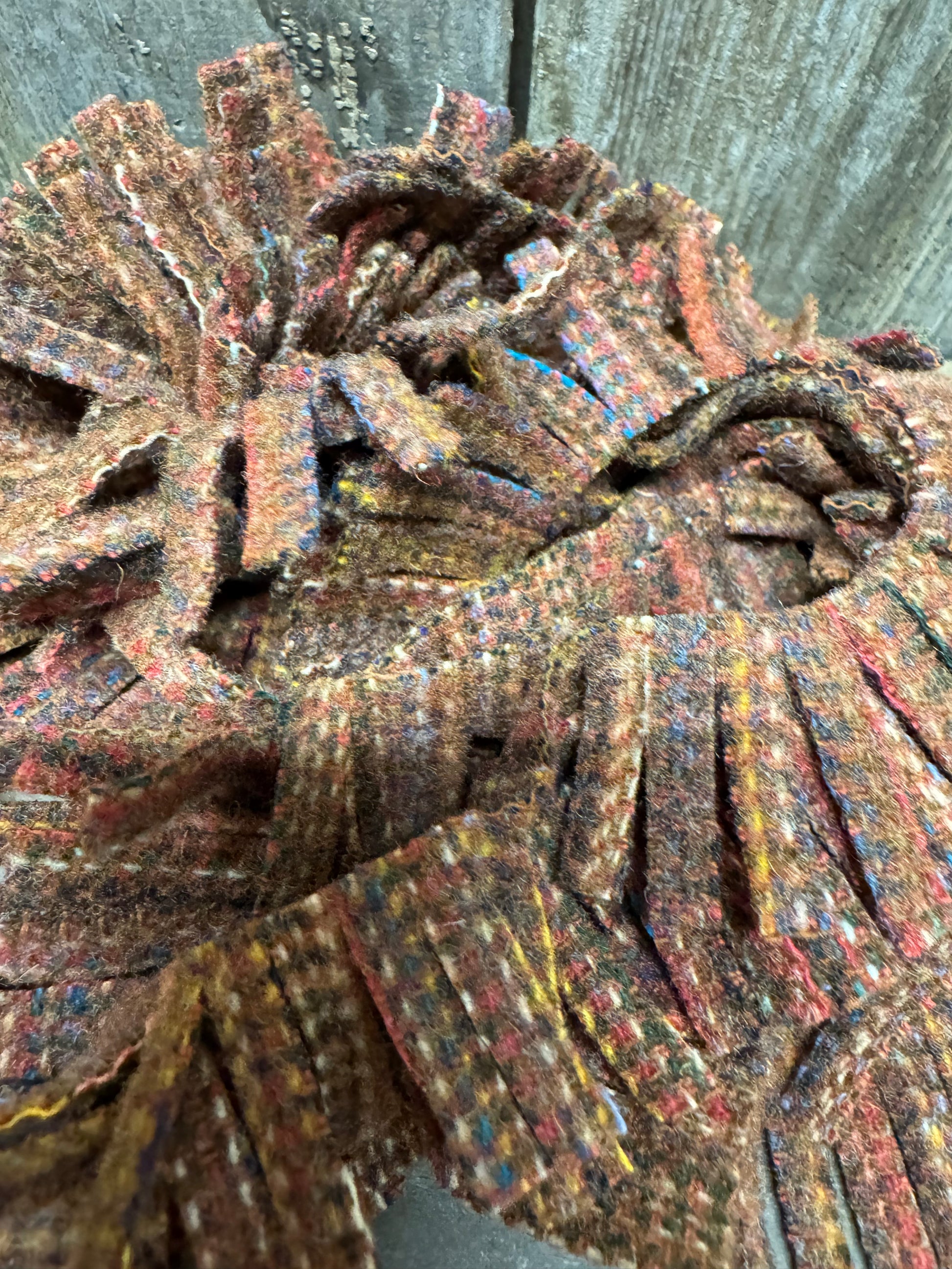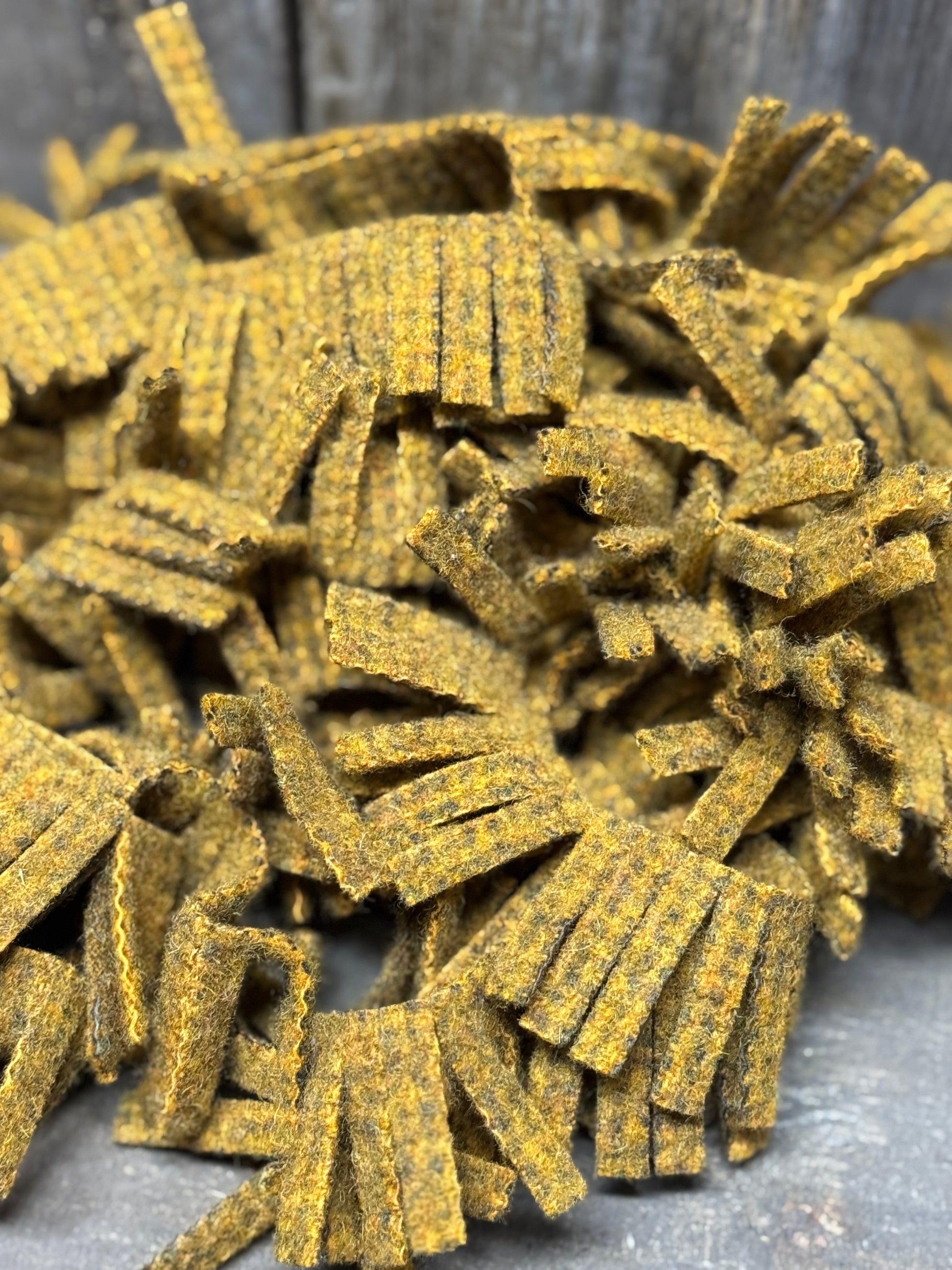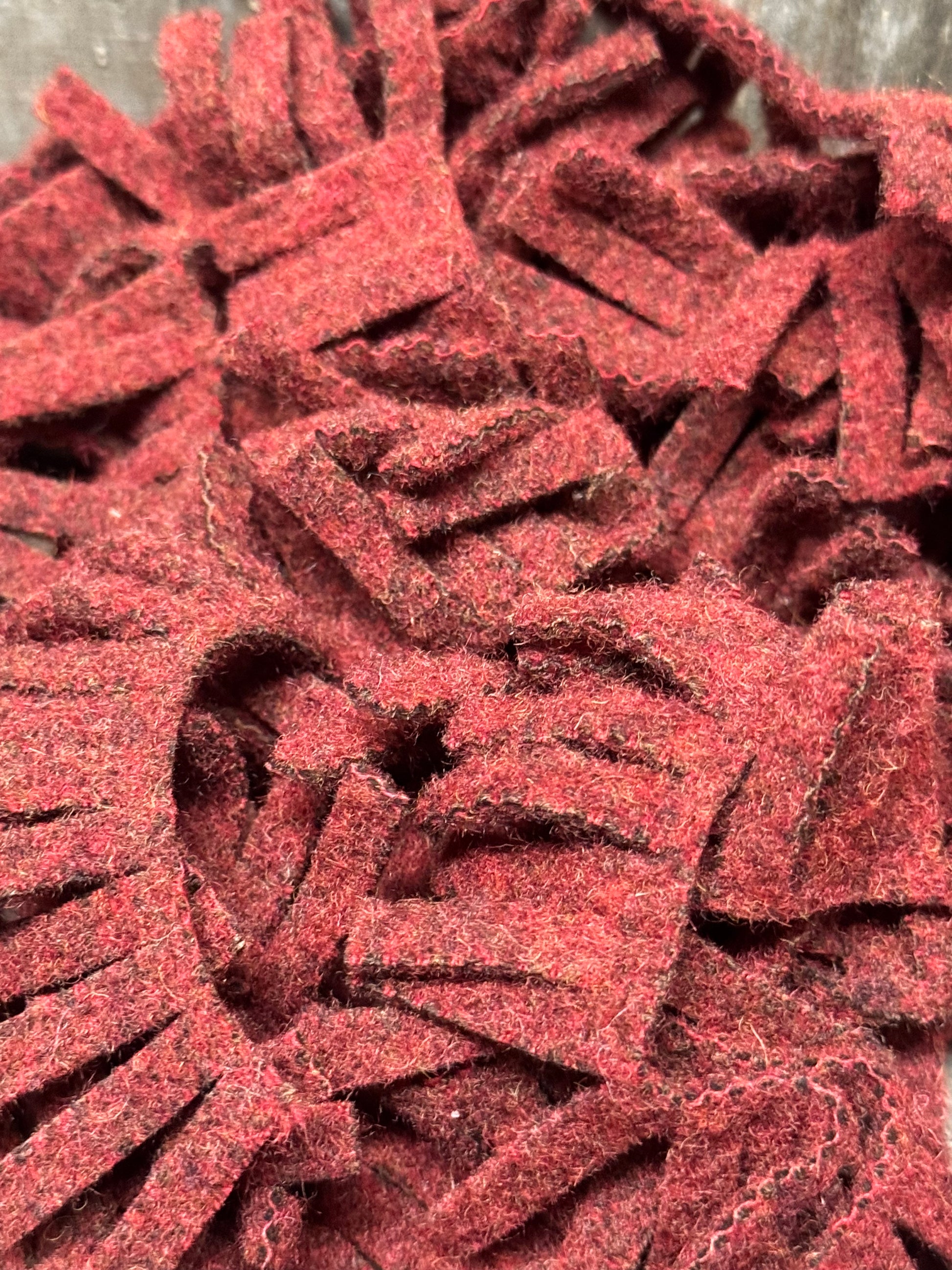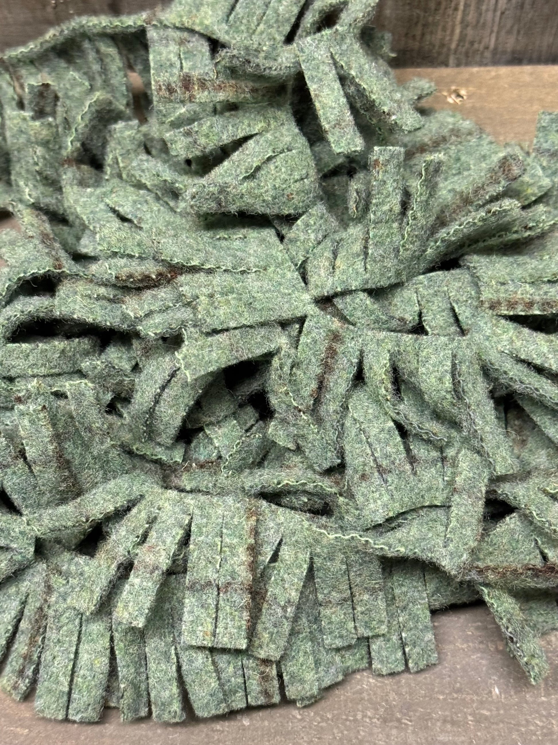 Perfect for wooly trees, boughs, wreaths and more, our die cut wool fringe makes crafting easier. You will receive 36, 1"x 18" felted wool fringe, there is 1/2 yard of wool used. Photos show our hand dyed wool in smaller sections on a twiggy wreath and wool roses for inspiration.
