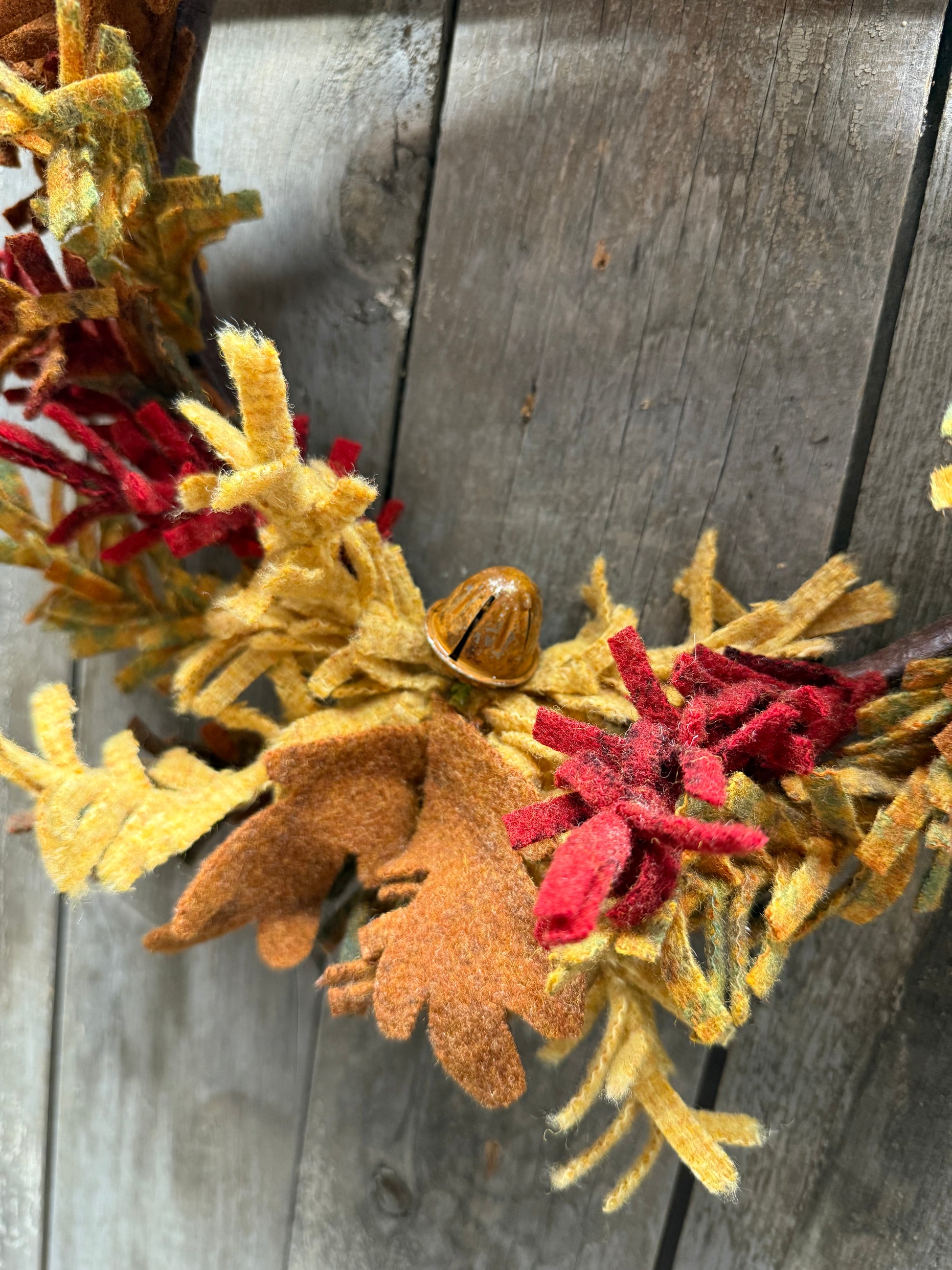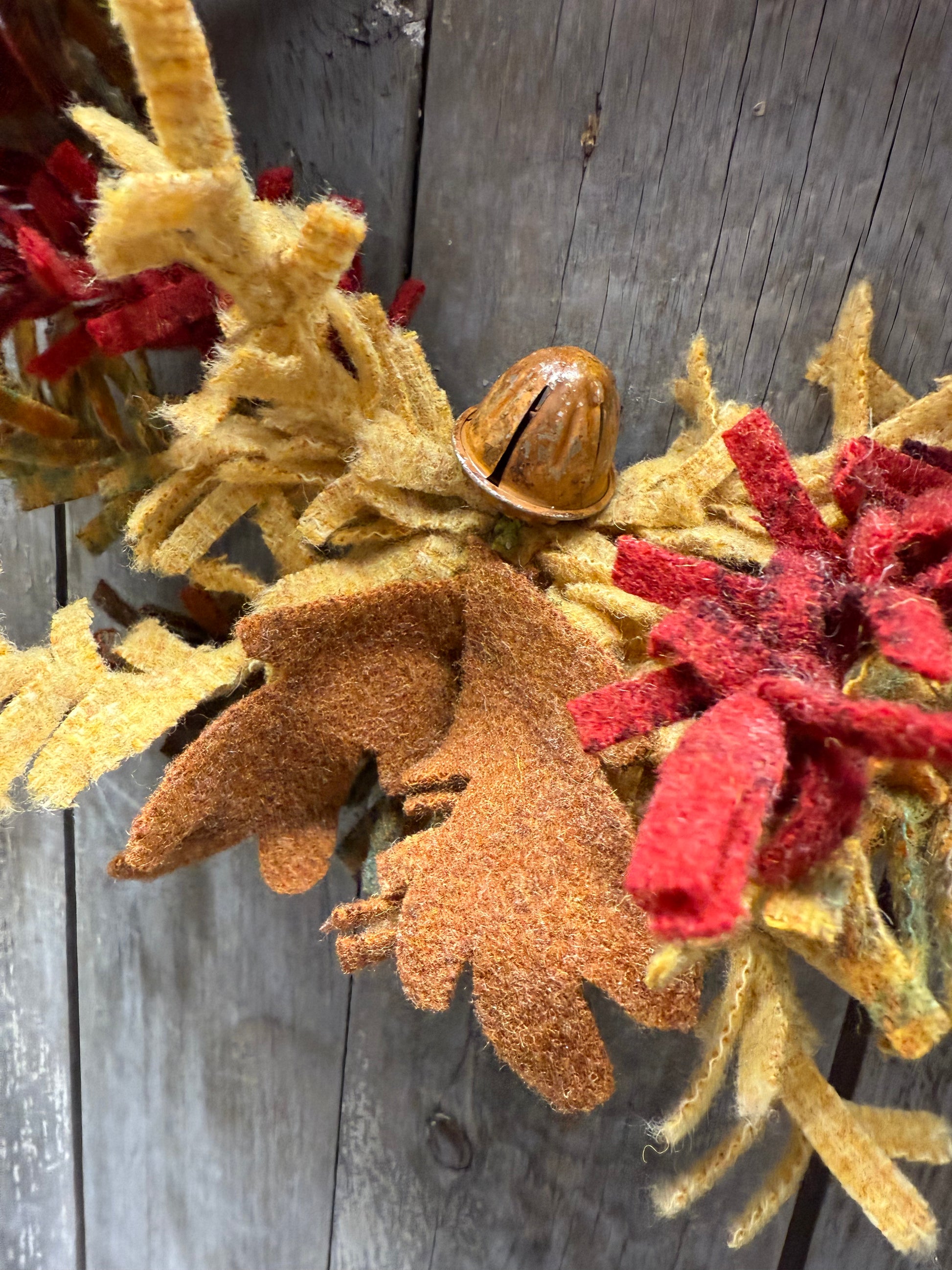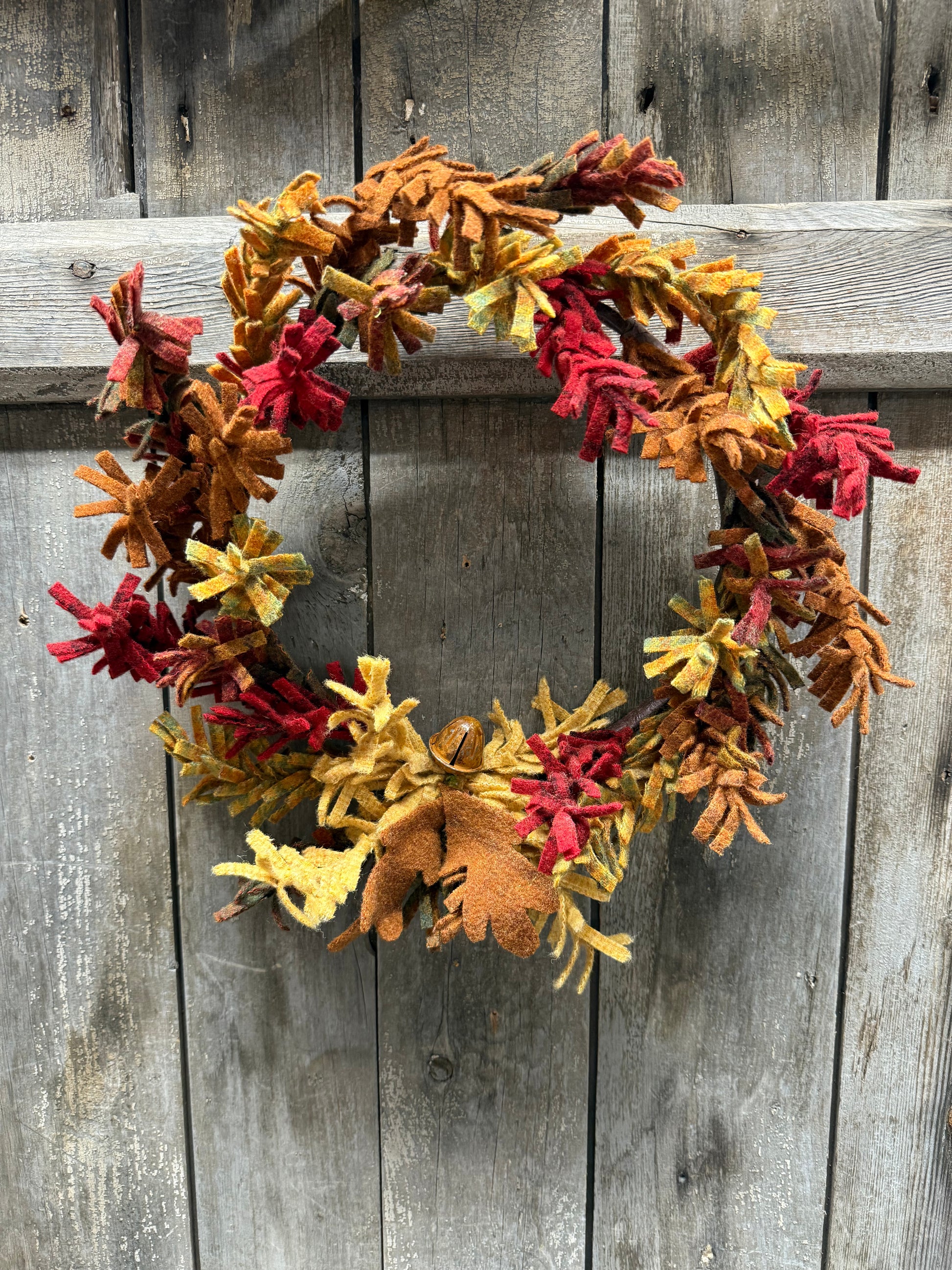 This 100% wool wreath is made lovingly by hand. Each branch is twisted and turned and attached to a backer frame. A set of wool leaves and a rusty acorn bell adorn the bottom. Varying colors and pattern of wool create a lovely mix of Autumn colors. Made to order. Please expect 2 weeks for delivery.