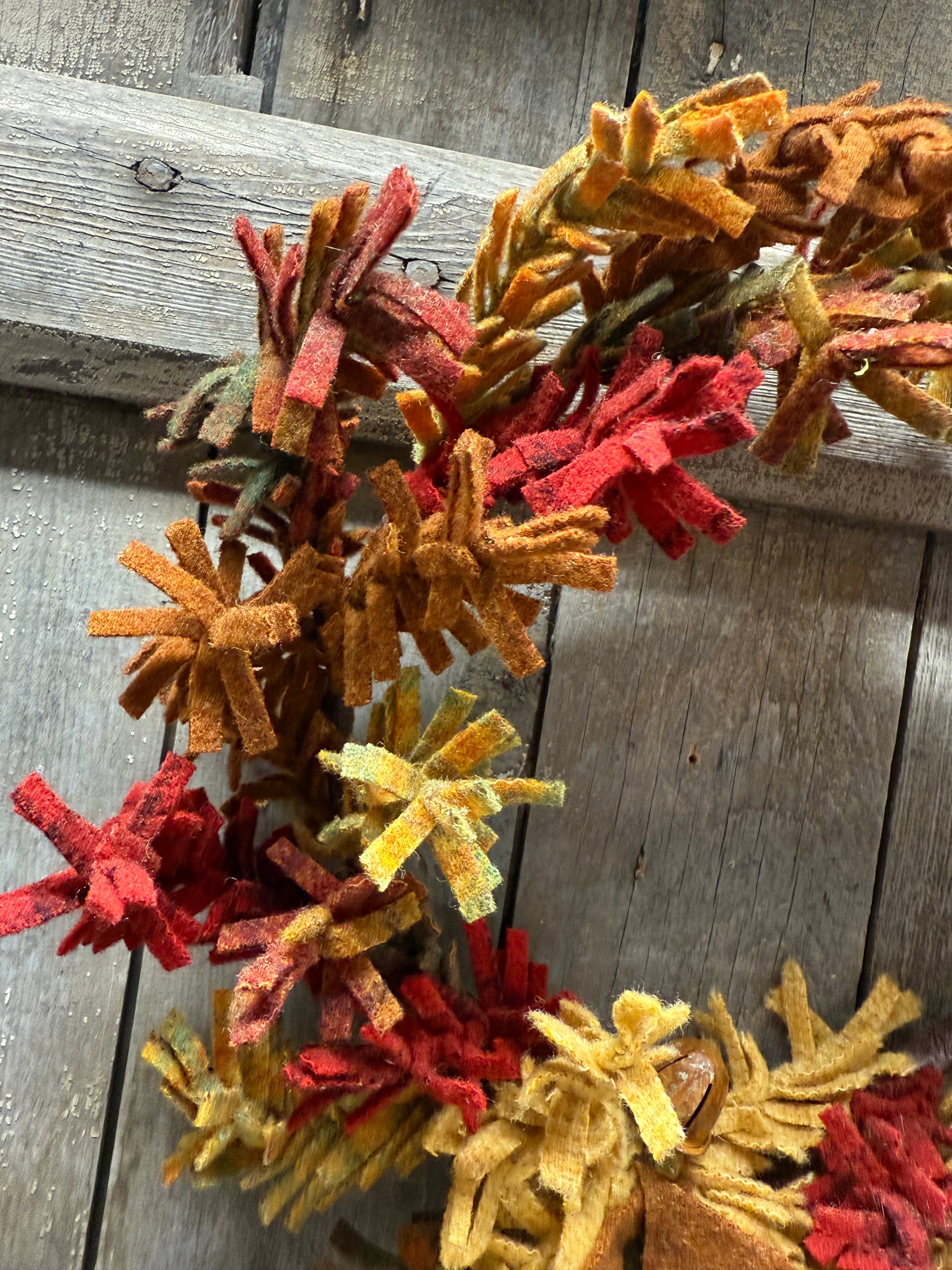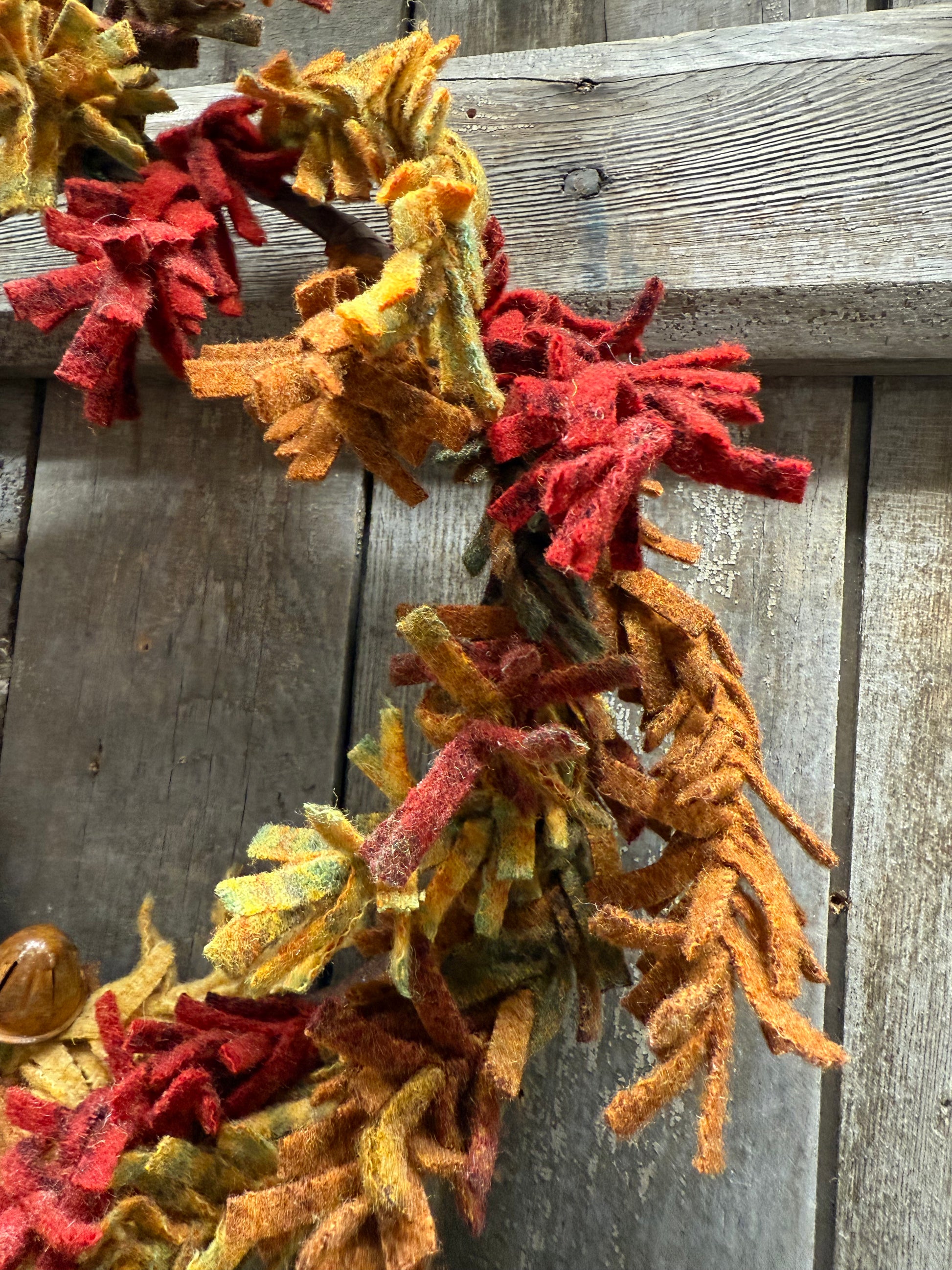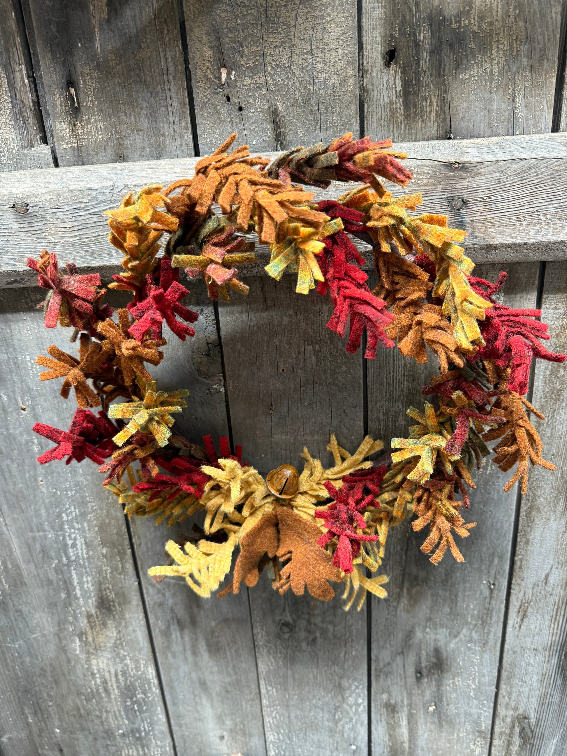 This 100% wool wreath is made lovingly by hand. Each branch is twisted and turned and attached to a backer frame. A set of wool leaves and a rusty acorn bell adorn the bottom. Varying colors and pattern of wool create a lovely mix of Autumn colors. Made to order. Please expect 2 weeks for delivery.