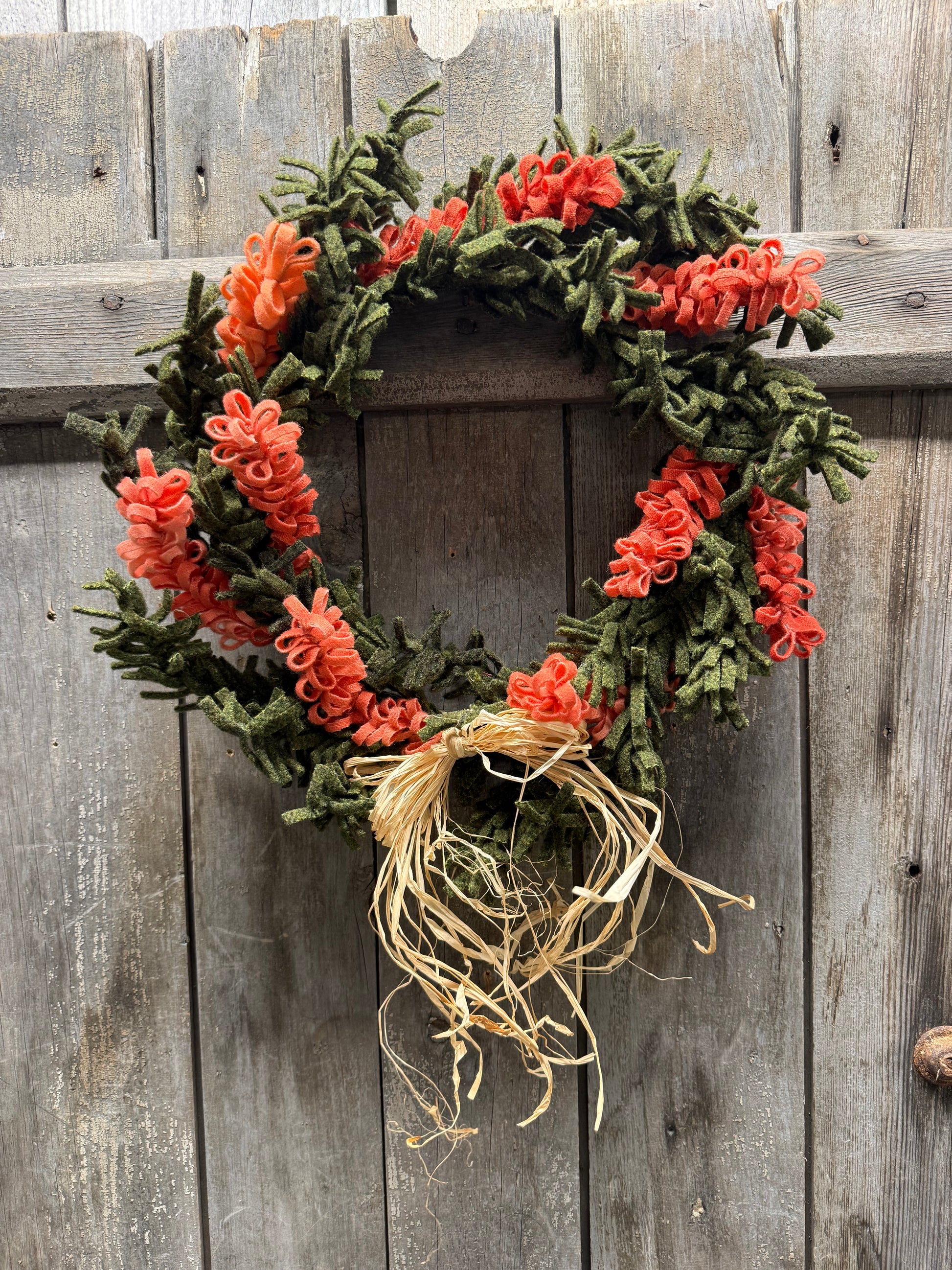 Hand crafted locally using mostly wool and grapevine, these wreaths are made from twisting and turning wool strips into sprigs of greenery and florals. Each is made by hand.