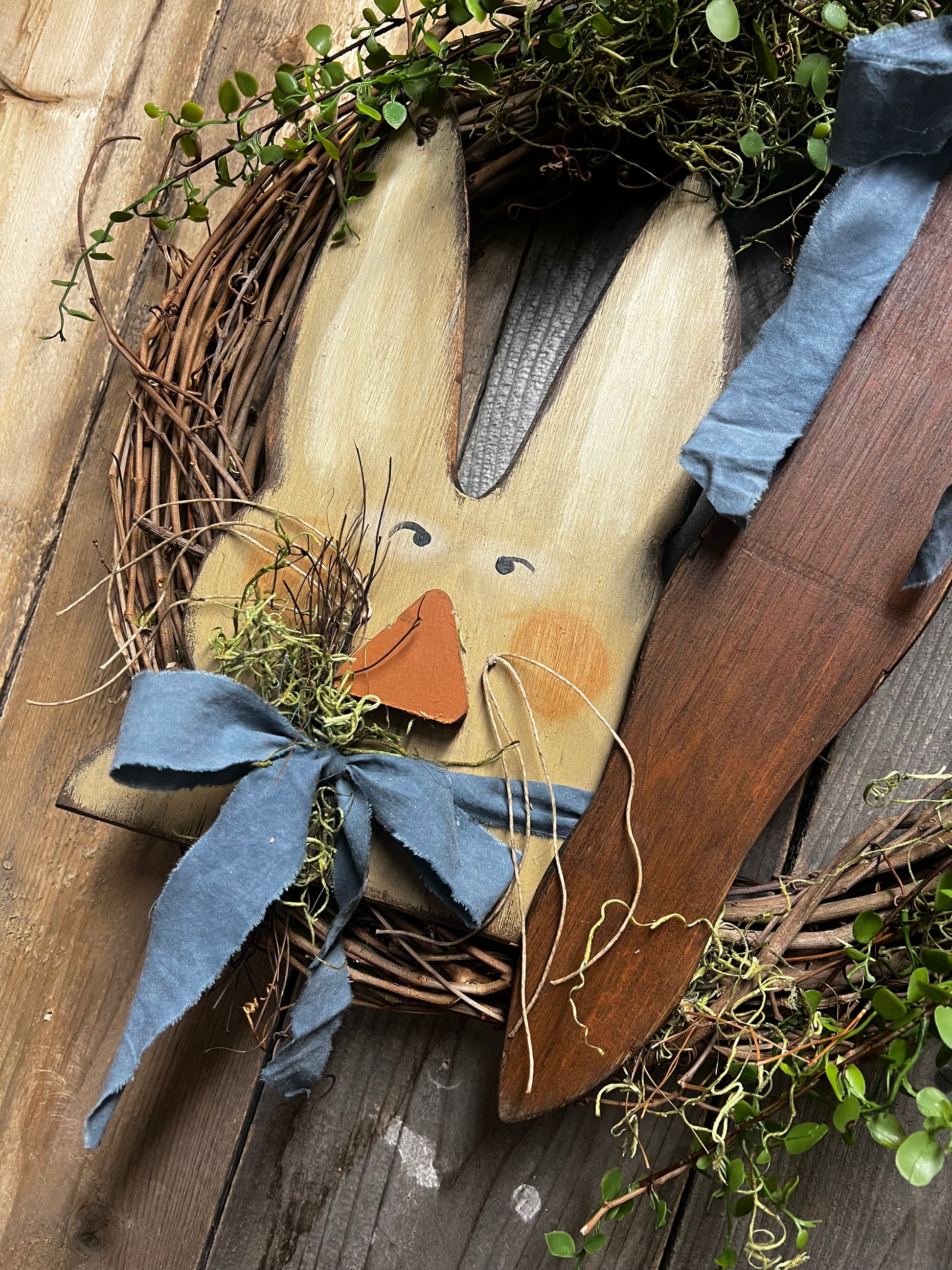 Welcome Spring with our grapevine based wreath adorned with wispy greens, spanish moss and hand crafted wooden accents. Designed by us and cut by our local "guy", we "weathered" the wood, painted, distressed and waxed both the rabbit and carrot. We use all pieces of the plywood sheeting so please expect variations and what some may seem as flaws...we consider it character. Each is hand made and you may not receive the exact wreath shown. Wreaths are on average 20"x 20". NOTE colors are a bit more drab than they are showing in the photos.