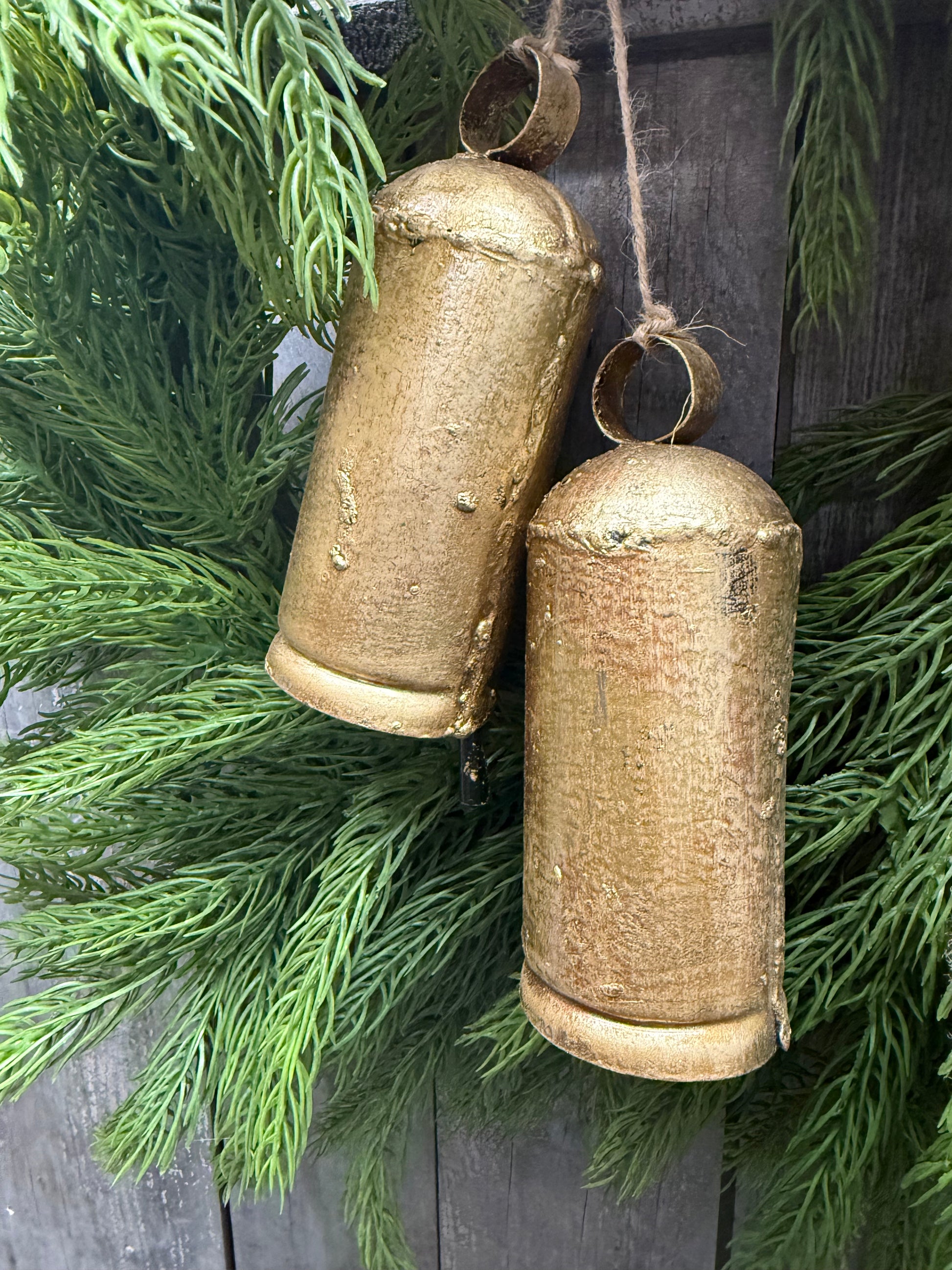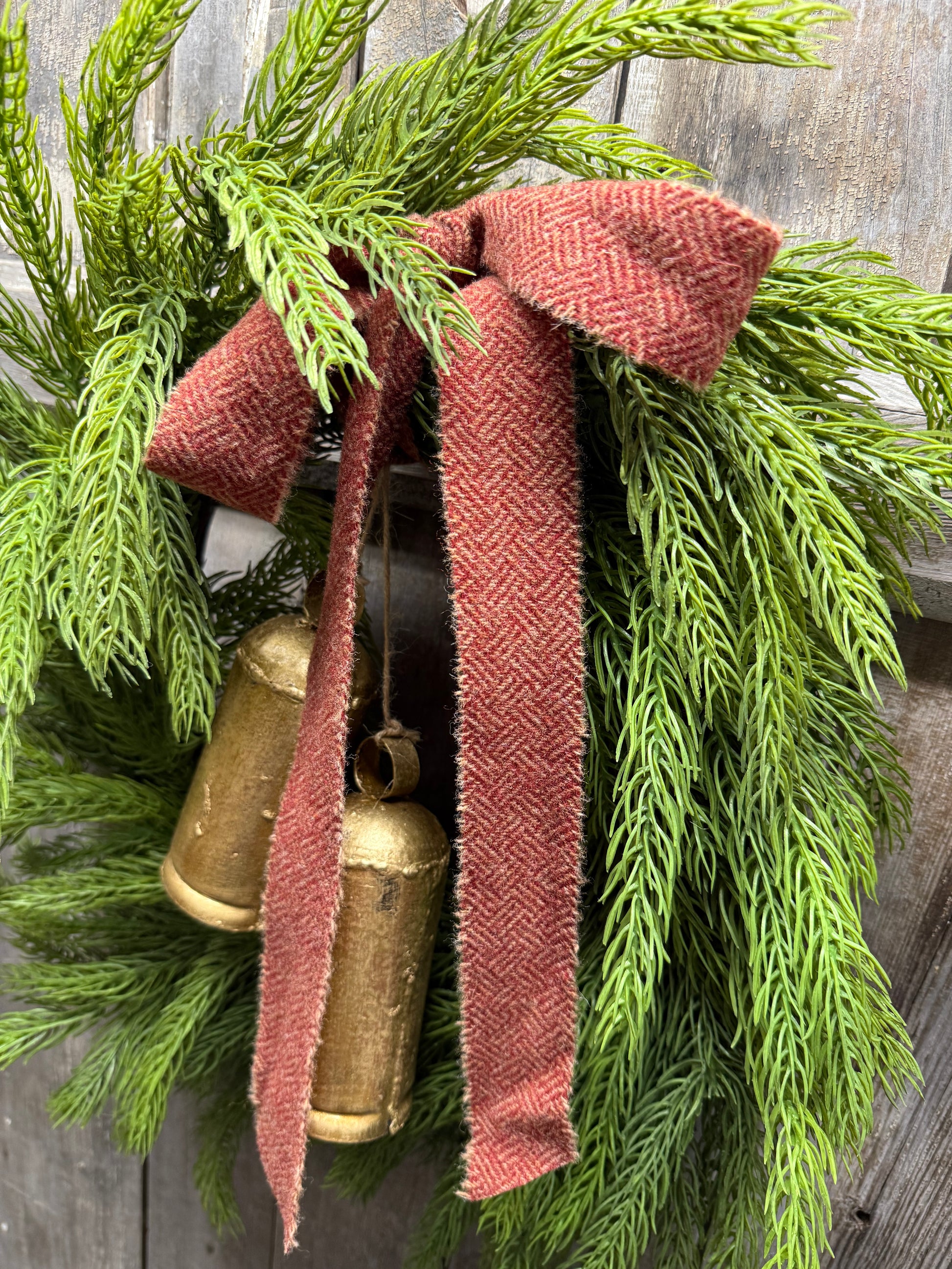 The Real Touch Grand Norfolk Wreath, measuring 21" is stunning on its own but when you add bells and a simple wool bow; you get a masterpiece. The realistic "natural feel" of the pine is the perfect setting; simple yet elegant. "Brass" bells each are 6.5" long. Vine backing on wreath. Each wreath is assembled by hand at LVP so slight variations may occur.