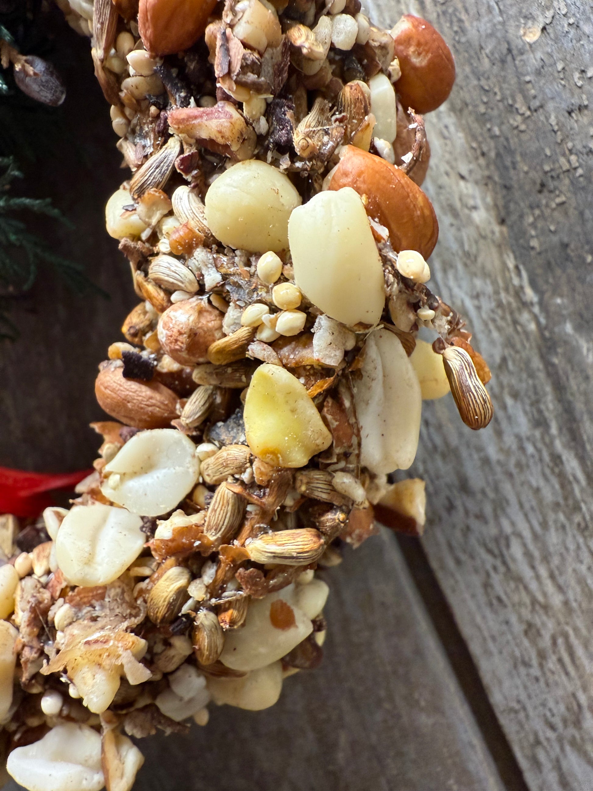 A 6″ grapevine wreath coated with premium bird seed and nuts.